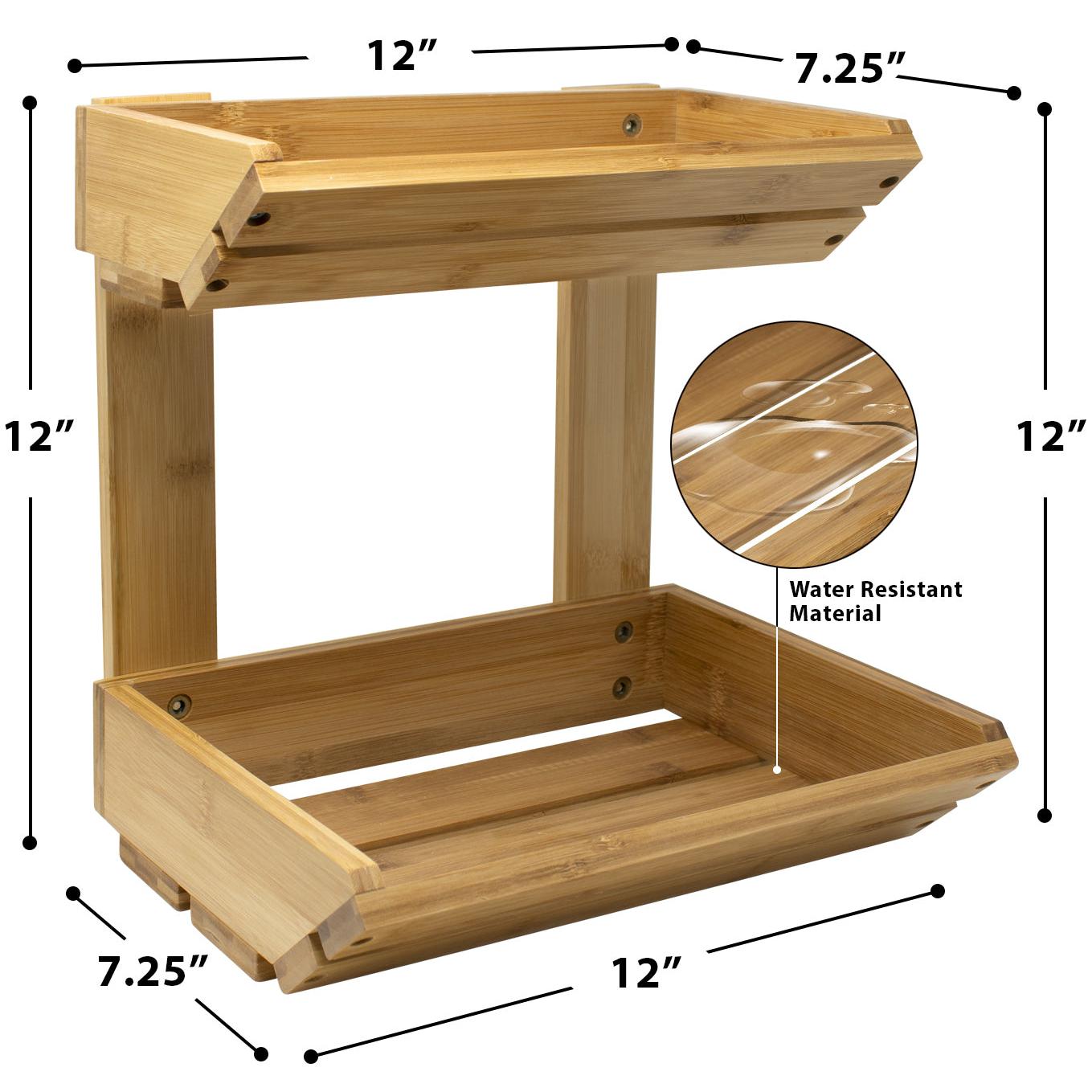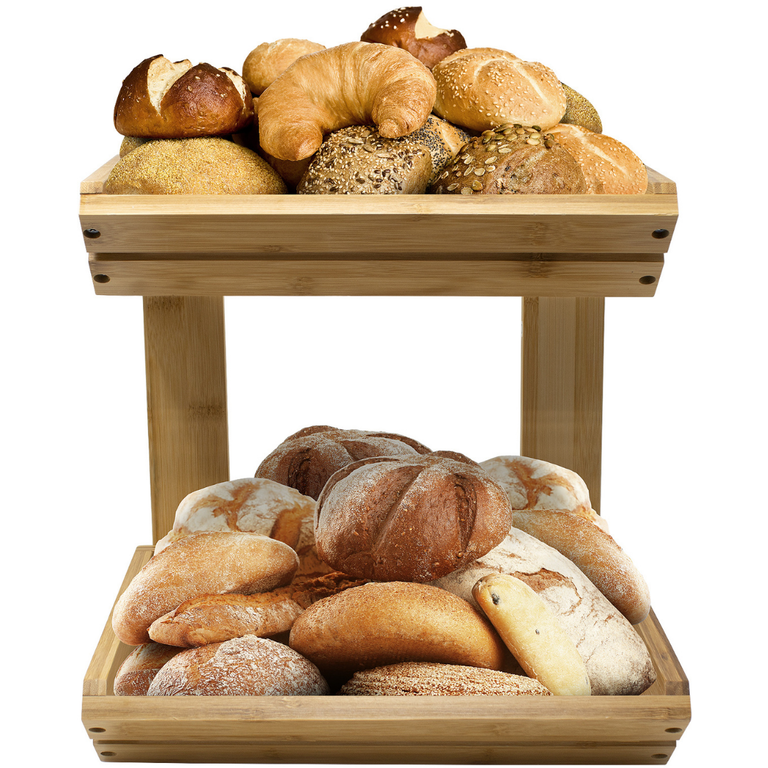 Made of bamboo, this 2-Tier Basket Stand is practical for everyday use in the kitchen or entertaining on the buffet. Store anything from bread, fresh fruit, spices, and snacks, to general household. The versatile design allows you to maximize vertical space on any countertop or dissemble into two separate serving pieces.