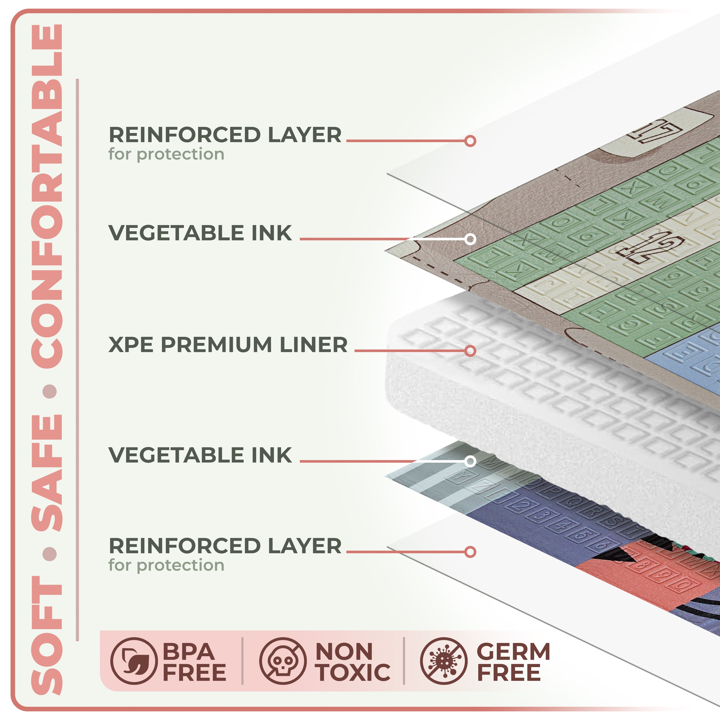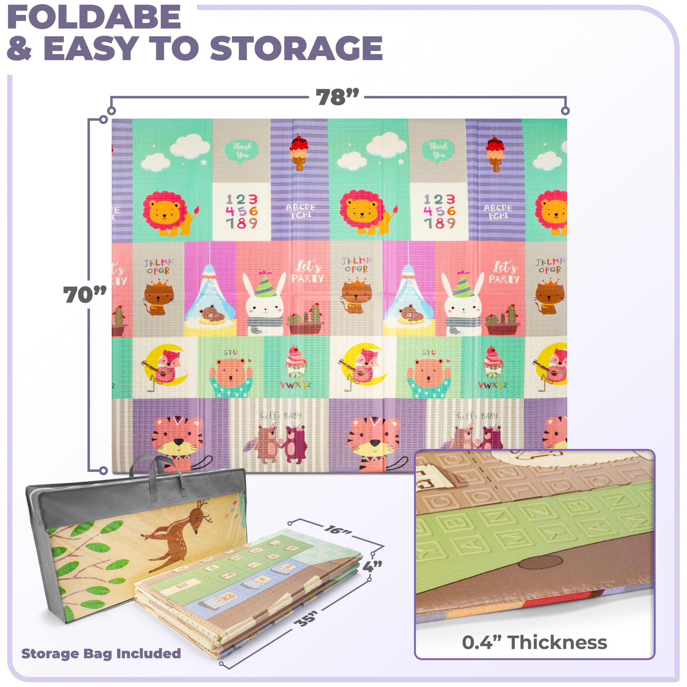 The mat is designed with versatility in mind, making it perfect for both indoor and outdoor use. Its lightweight and foldable design allow for easy transport and setup, whether you're laying it out in the living room, taking it to the park, or setting it up in the backyard. The durable, waterproof surface can withstand various weather conditions and is easy to clean, ensuring a safe and hygienic play area wherever you go. Enjoy a comfortable & secure play environment, whether indoors or out.