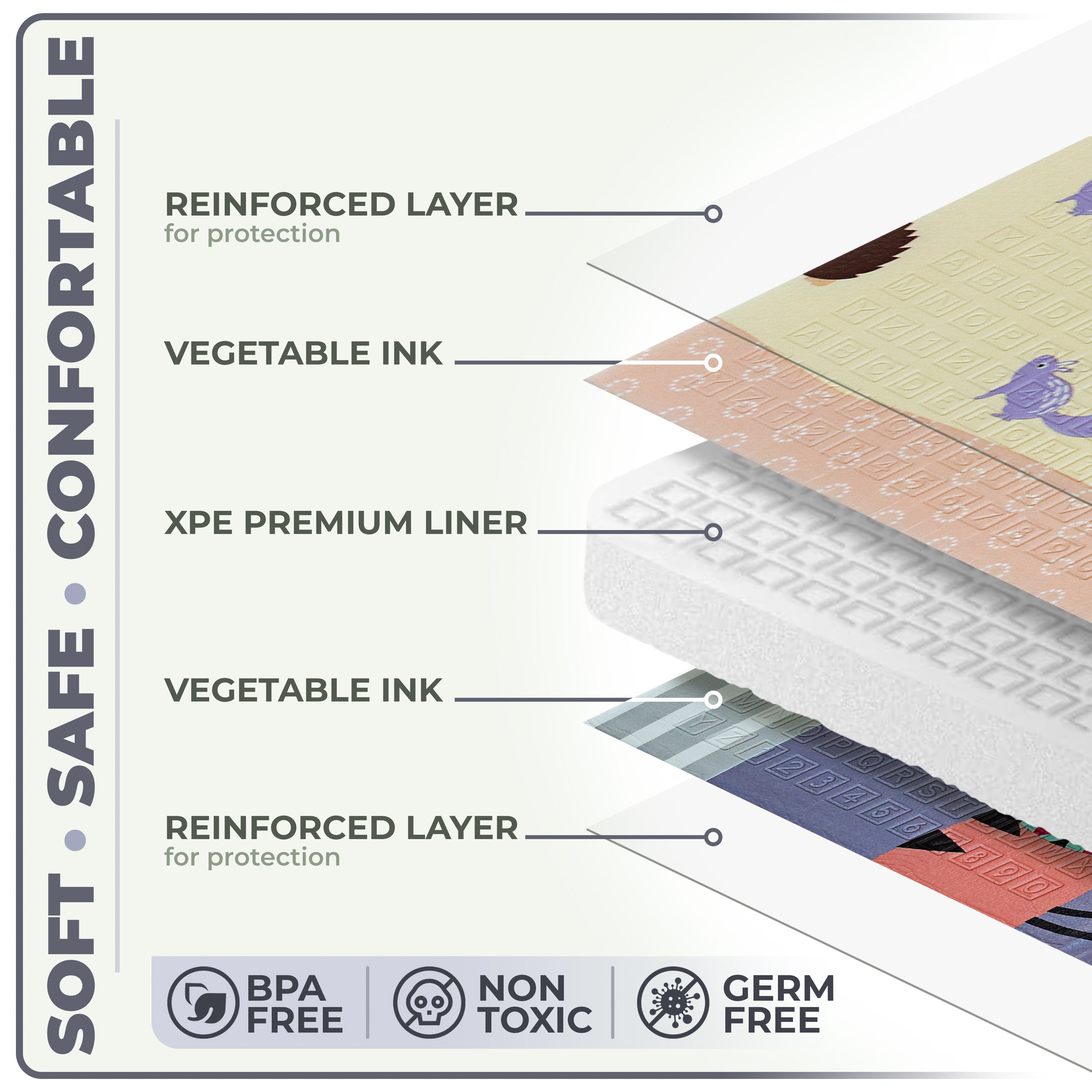 The mat is designed with versatility in mind, making it perfect for both indoor and outdoor use. Its lightweight and foldable design allow for easy transport and setup, whether you're laying it out in the living room, taking it to the park, or setting it up in the backyard. The durable, waterproof surface can withstand various weather conditions and is easy to clean, ensuring a safe and hygienic play area wherever you go. Enjoy a comfortable & secure play environment, whether indoors or out.