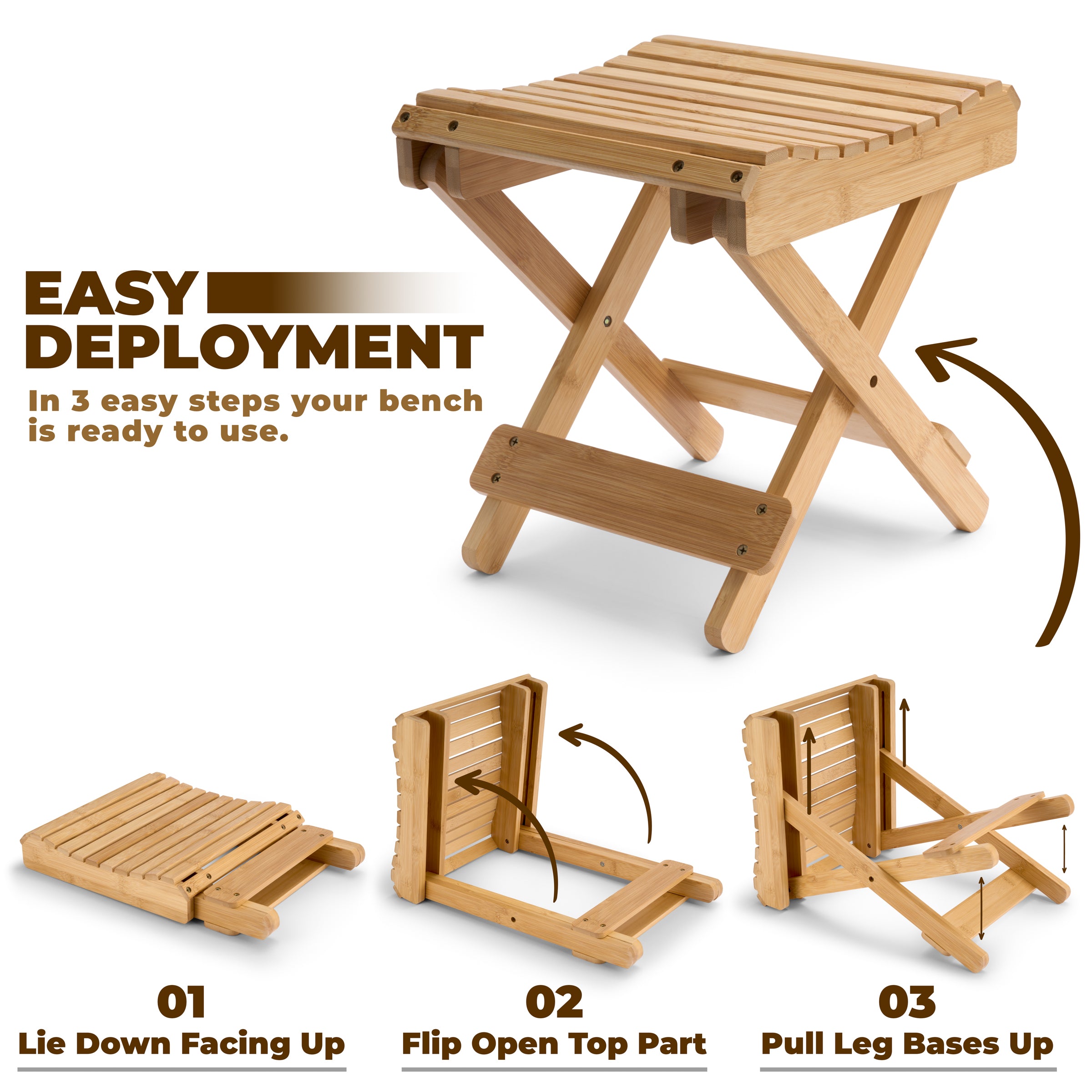 From the bathroom to the entryway, this foldable bamboo stool offers support for any task. Shave your legs in the shower, scrub the bottom of your feet, or lace up your shoes in the entryway. When bathroom storage is limited, it doubles as a spa-like display to keep fresh towels and toiletries. The compact design is easy to move around and can be used as a fully functional seat for toddlers. The bamboo construction is mold and mildew resistant for lasting use and vented to allow soap and water to pass through. It comes fully assembled and fits in most spaces. When not in use, simply fold it flat for easy storage.