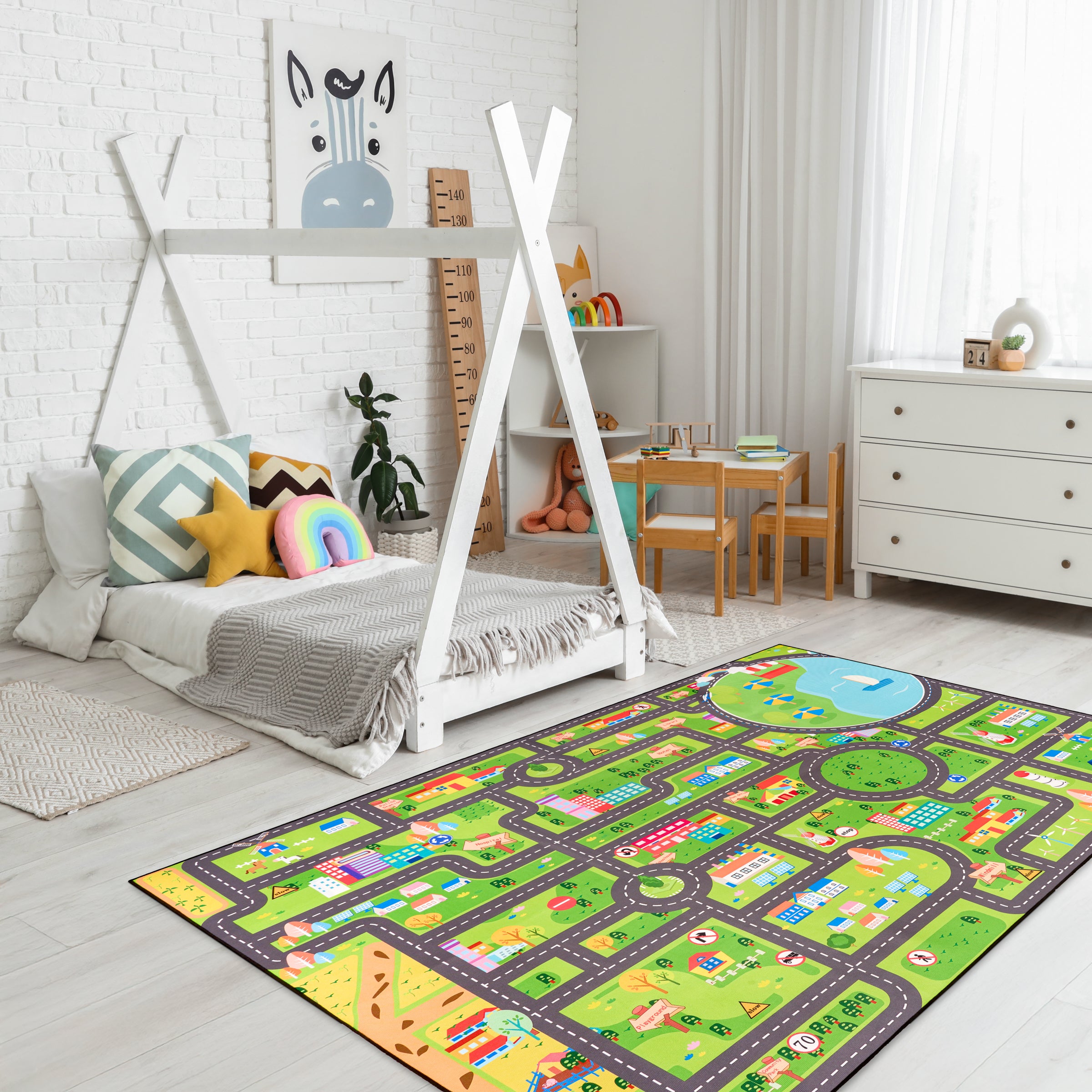 Introducing the Sorbus Kids Room colorful educational city map area Rug Carpet Collection, large and extra-large, the perfect addition to any young adventurer's space. Our boys' room rug is designed to spark creativity and imagination, which promotes make-believe play, interactive play, and cognitive play. It is also very colorful with clear drawings of a street map that covers roads, farms, police station, doctor’s office, movie theatre, hospital, library, beach, community park, hotel, lookout tower, school, post office, windmill, restricted areas, playground, and houses.