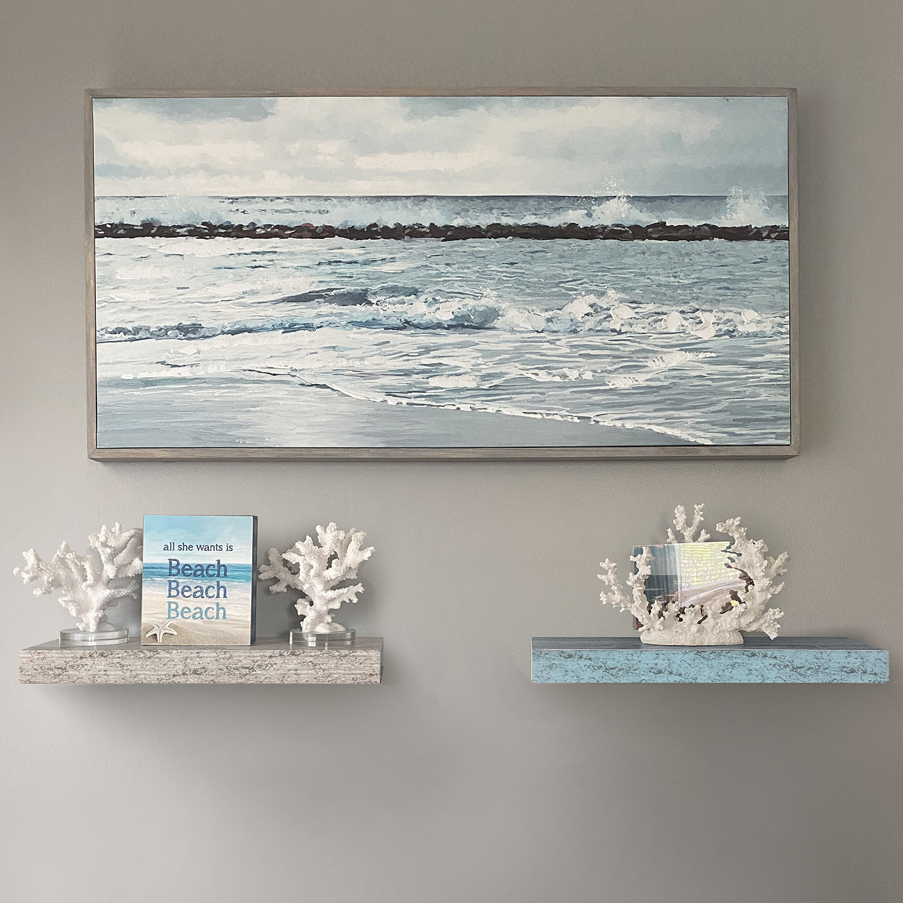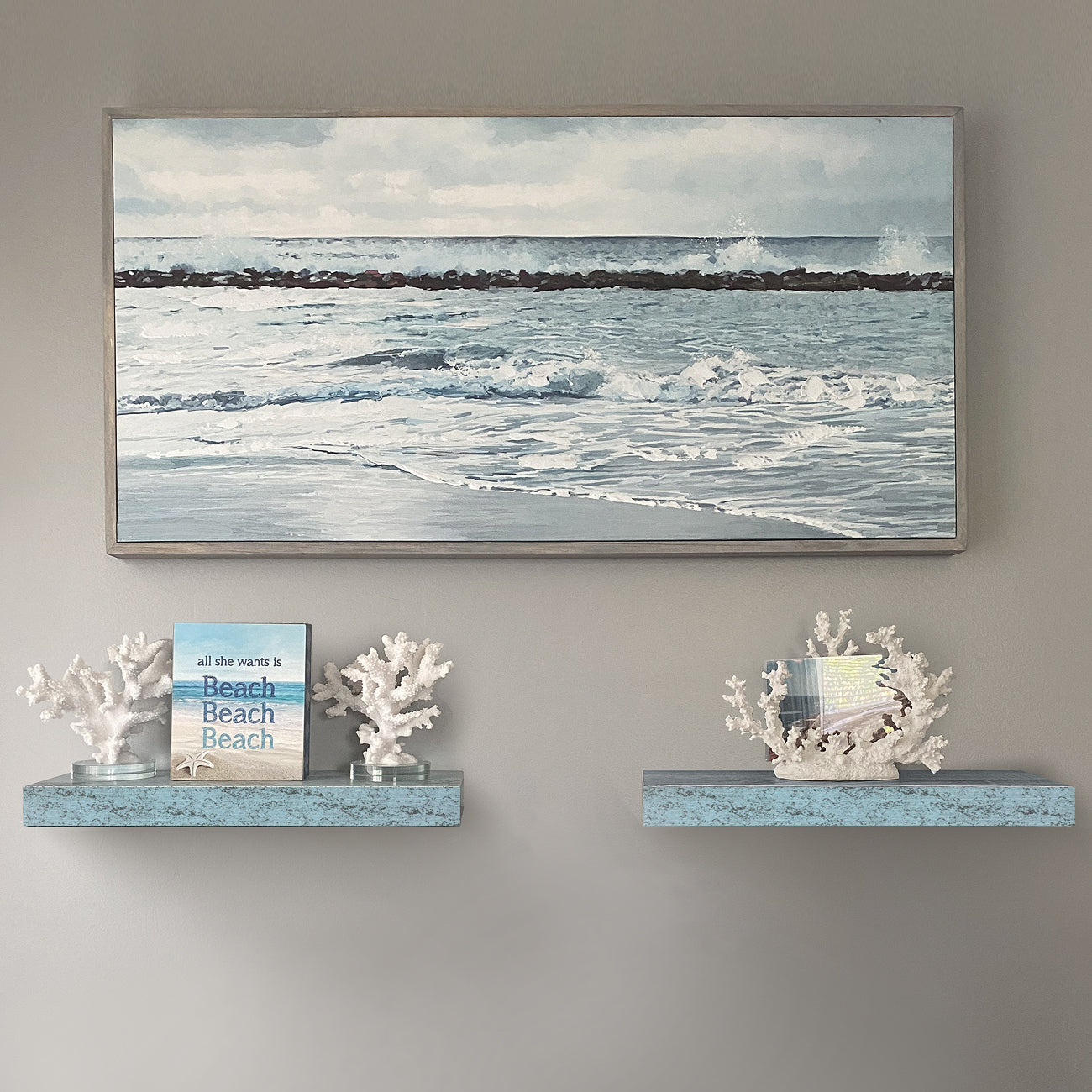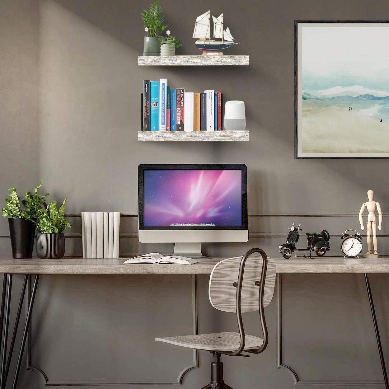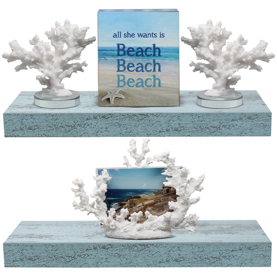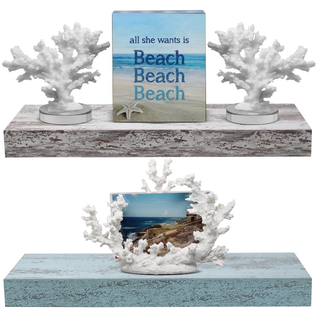 Part rustic, part coastal, this floating shelf duo is the perfect platform for storage and display. It features a rectangle silhouette with a faux wood finish, ideal for showcasing framed photos, succulents, and other home decor. Beautifully accent in your beach home, shabby chic themed space, or modern farmhouse living area. Installation is easy with the included mounting hardware. Hang on an empty wall above a desk, fireplace, between windows, or wherever you need visual interest.