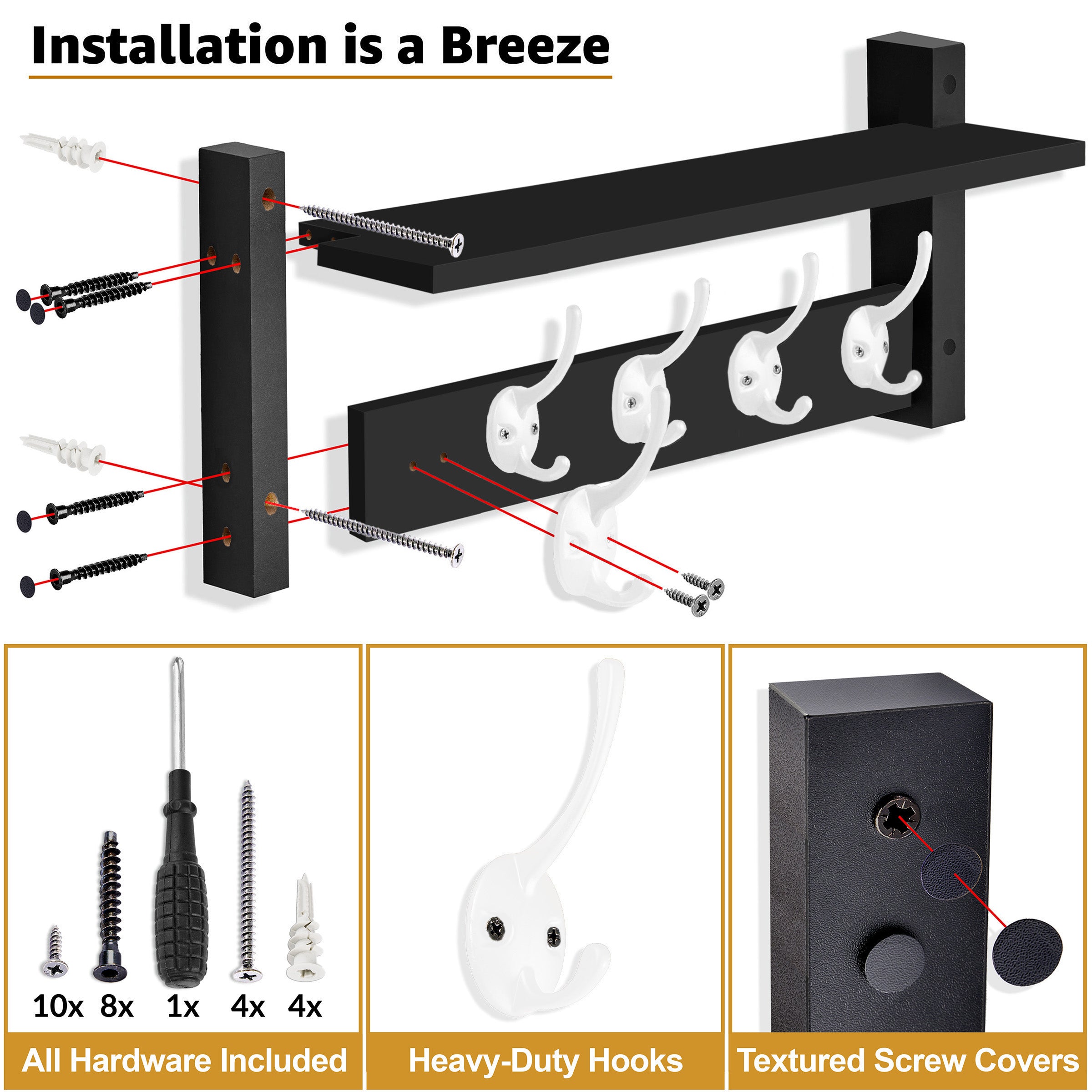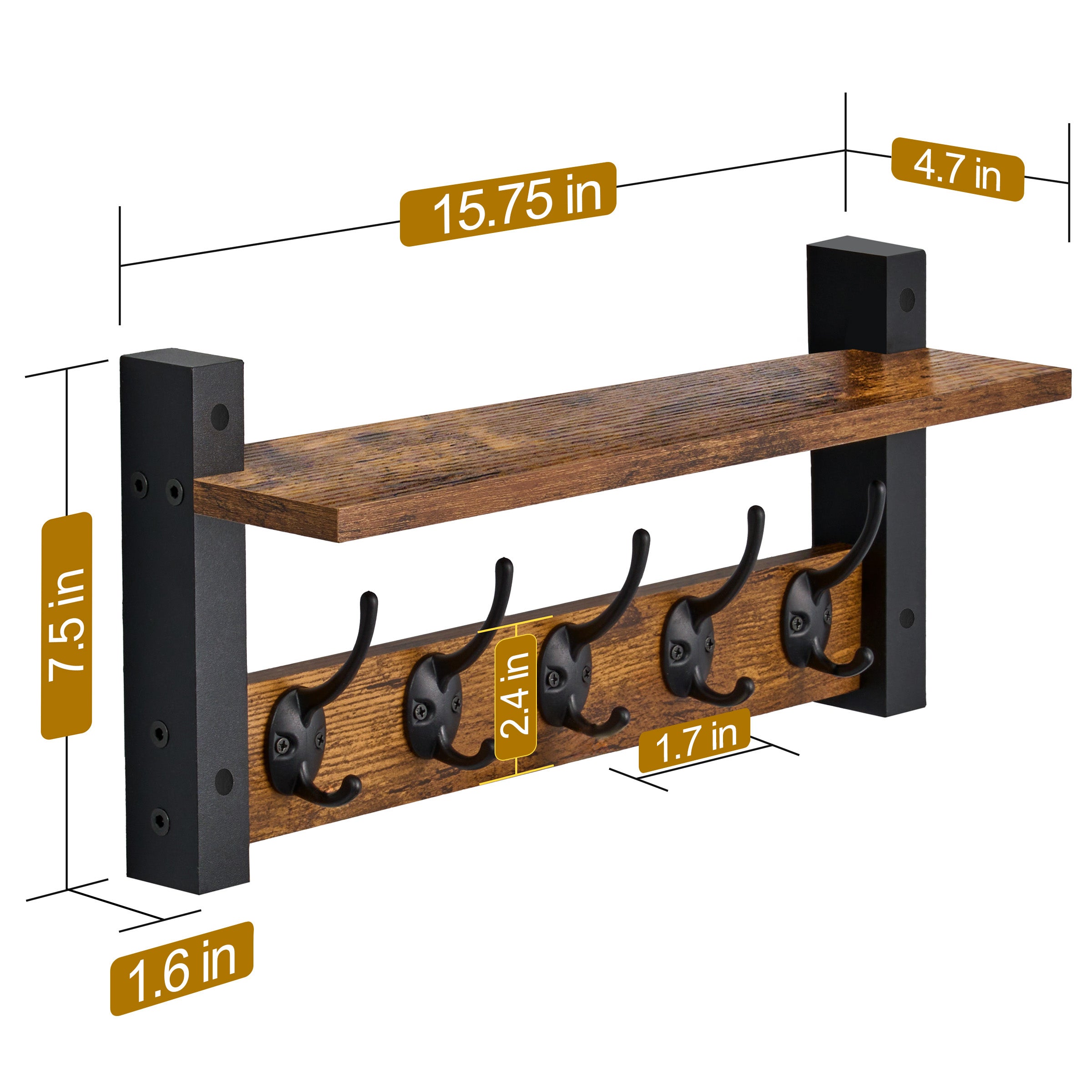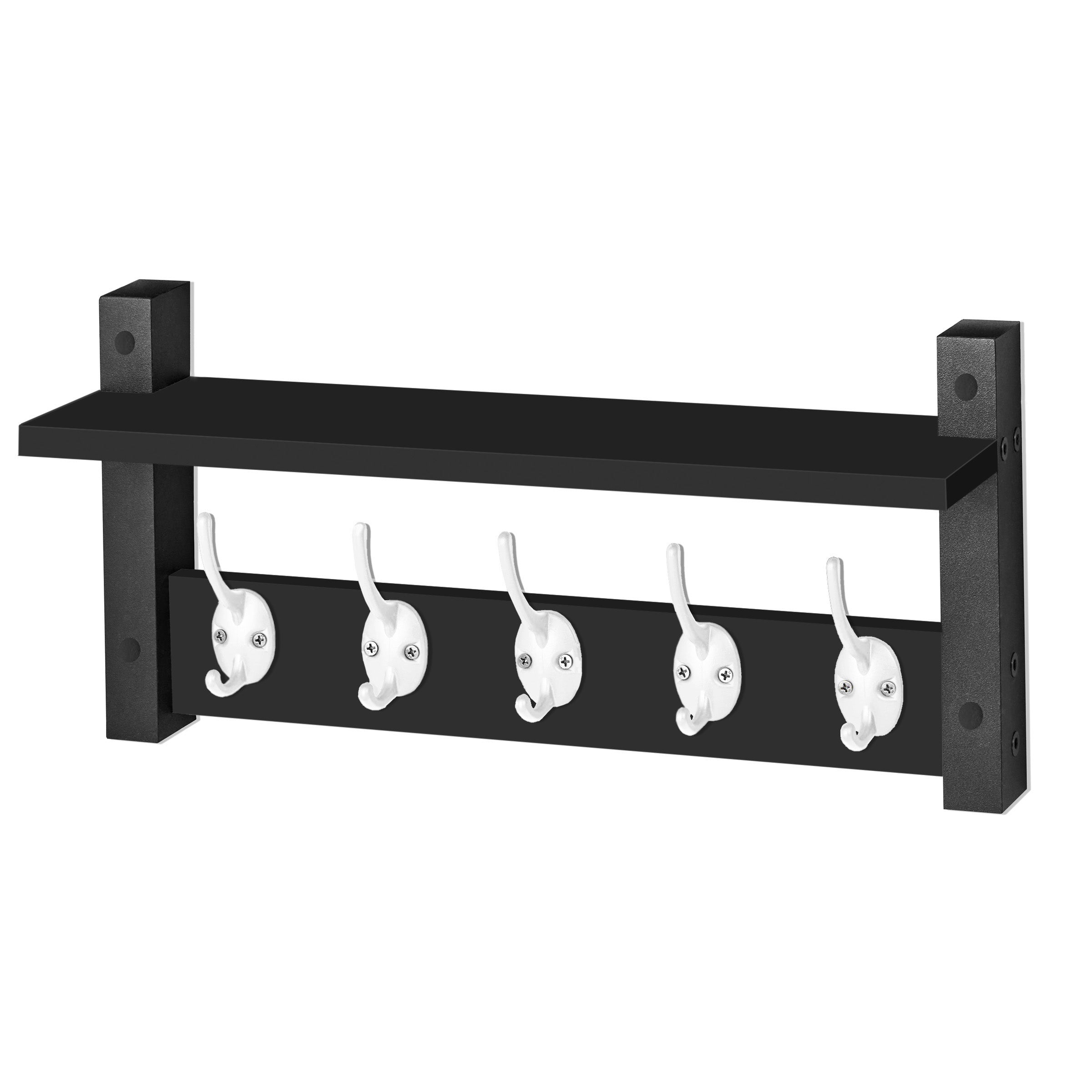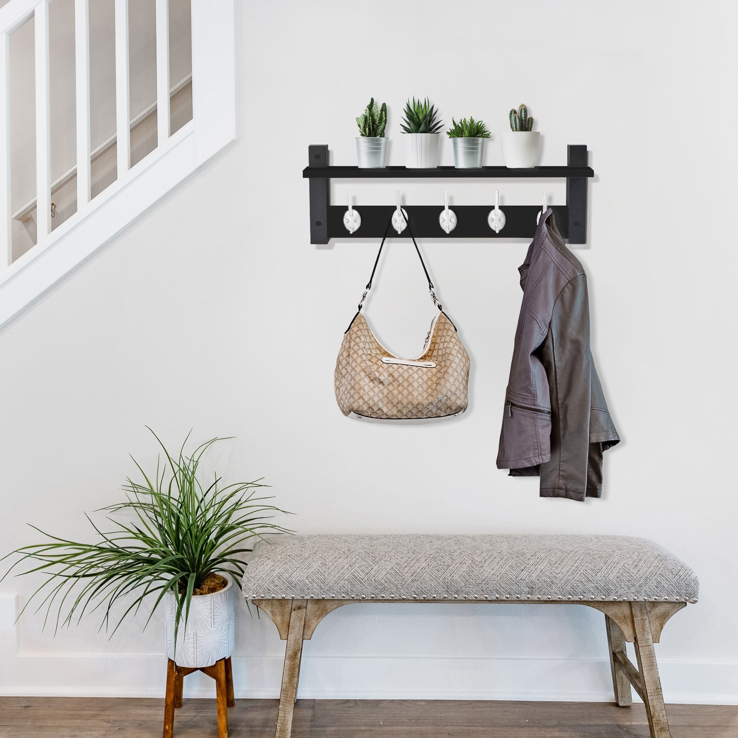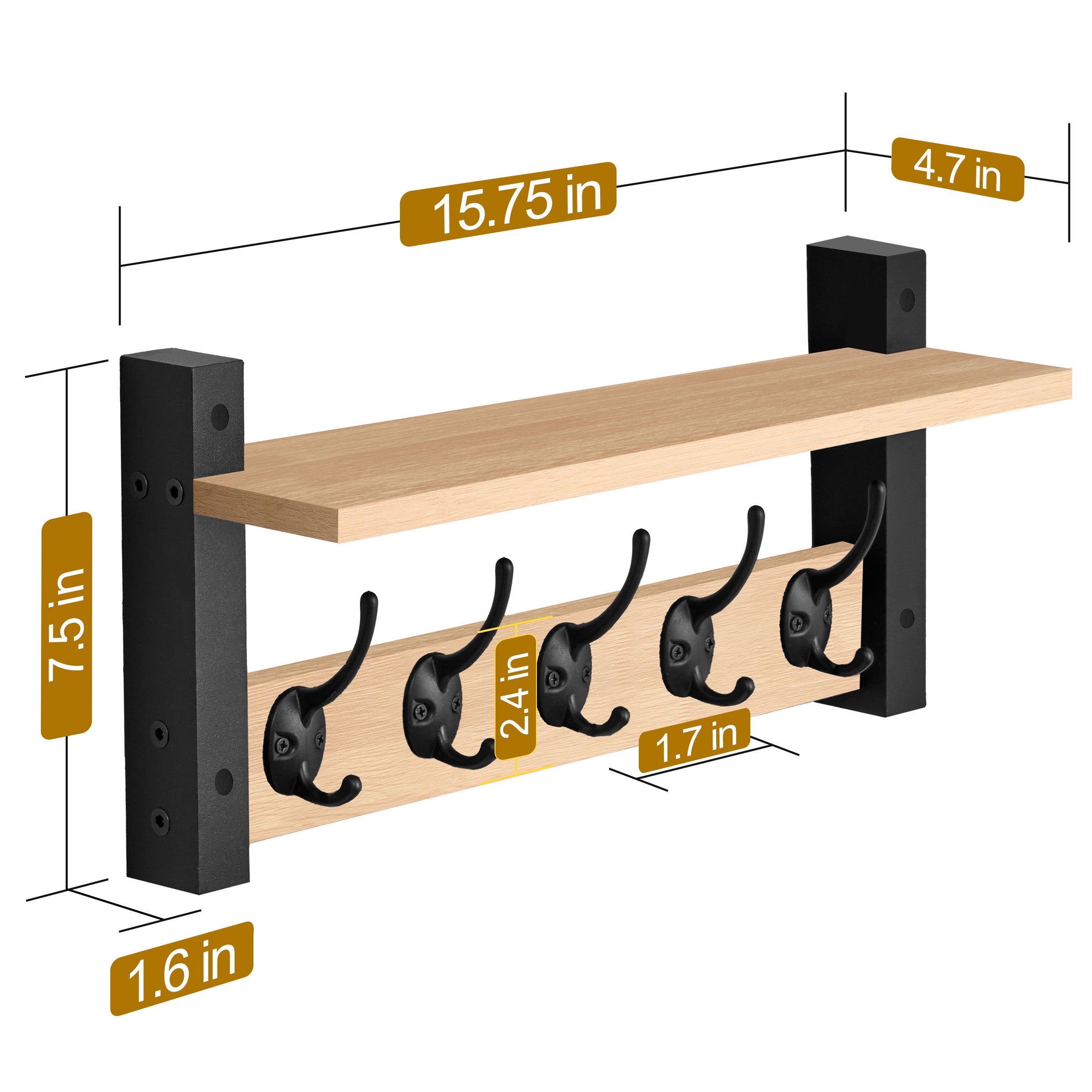Add both elegance & everyday function to your walls with this wall mount floating shelf with 5 hooks. Designed with versatility in mind, this sleek & compact wall rack accordion wall hanger hook rack makes the perfect addition to your entryway, bathroom, kitchen, mudroom, or even bedroom. The shelf is deep enough to hold picture frames, candles, or a small potted plant, while the 5 heavy-duty metal hooks offer ample hanging storage for coats, scarves, bags, or hats.