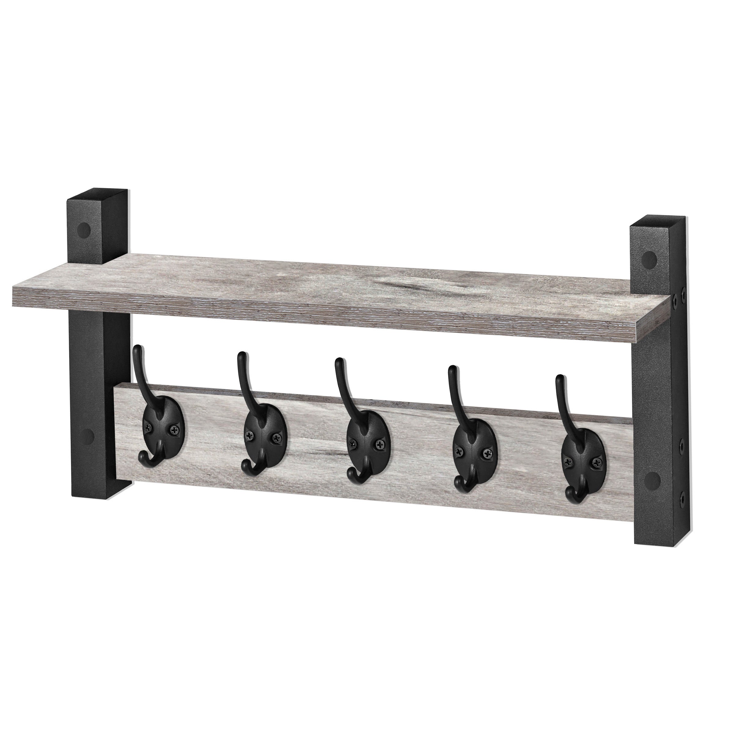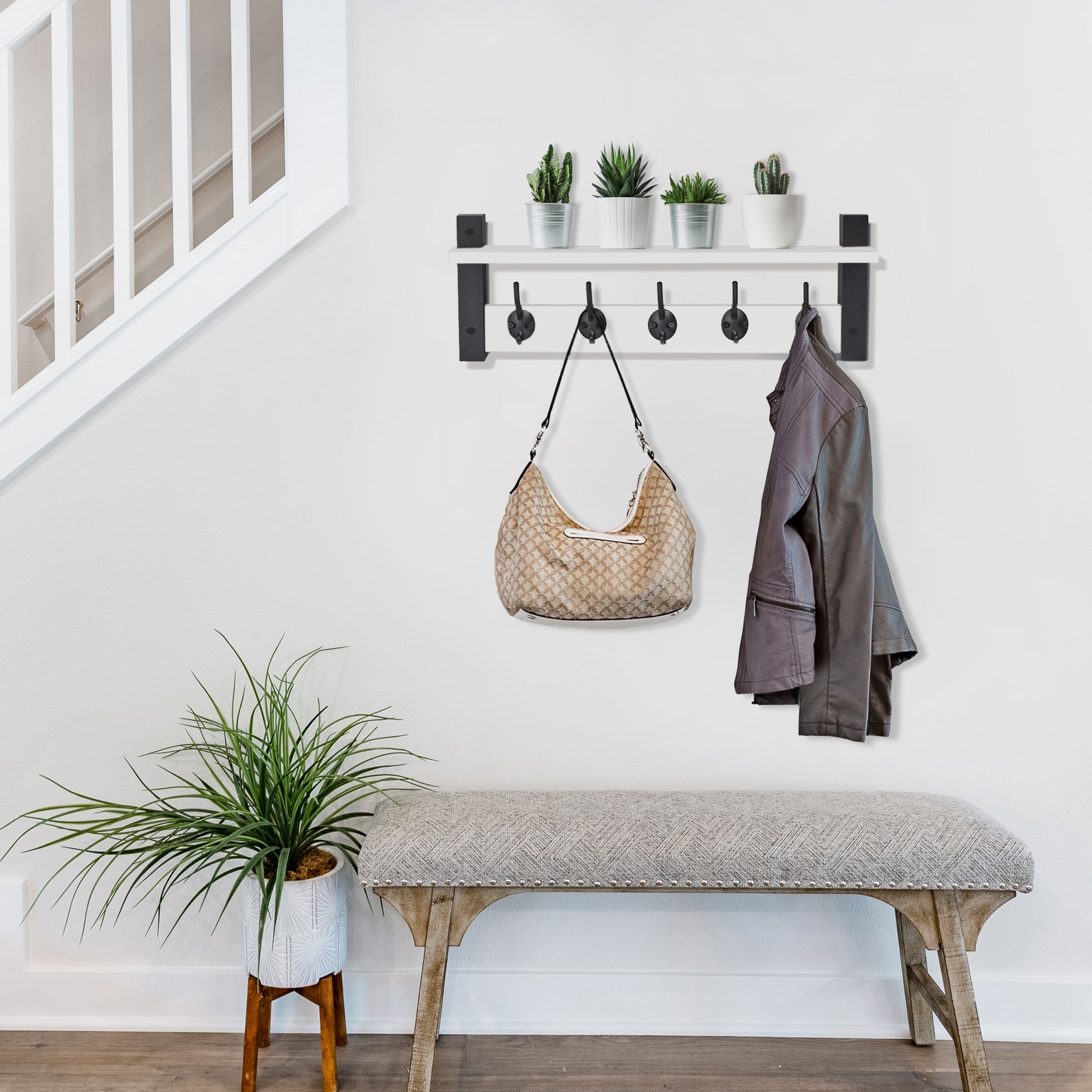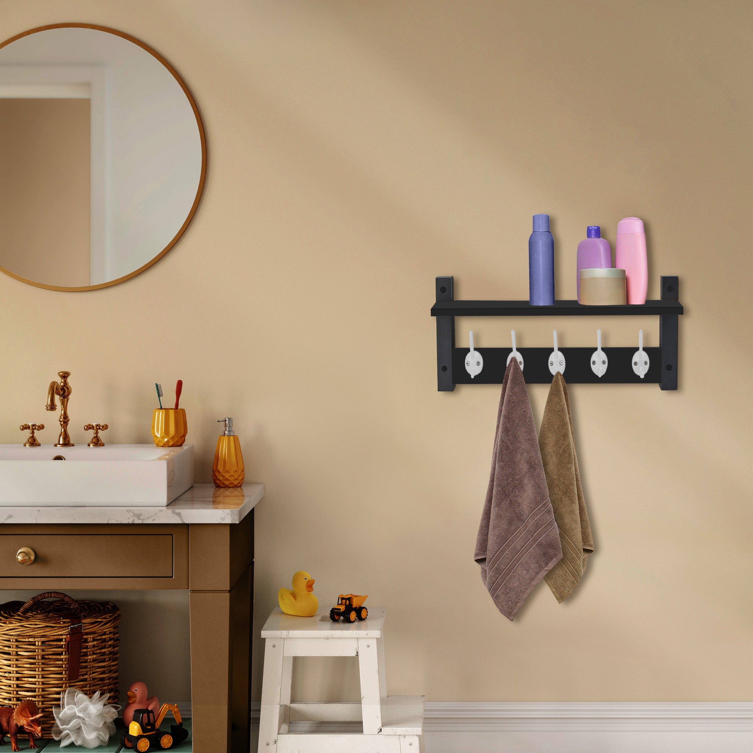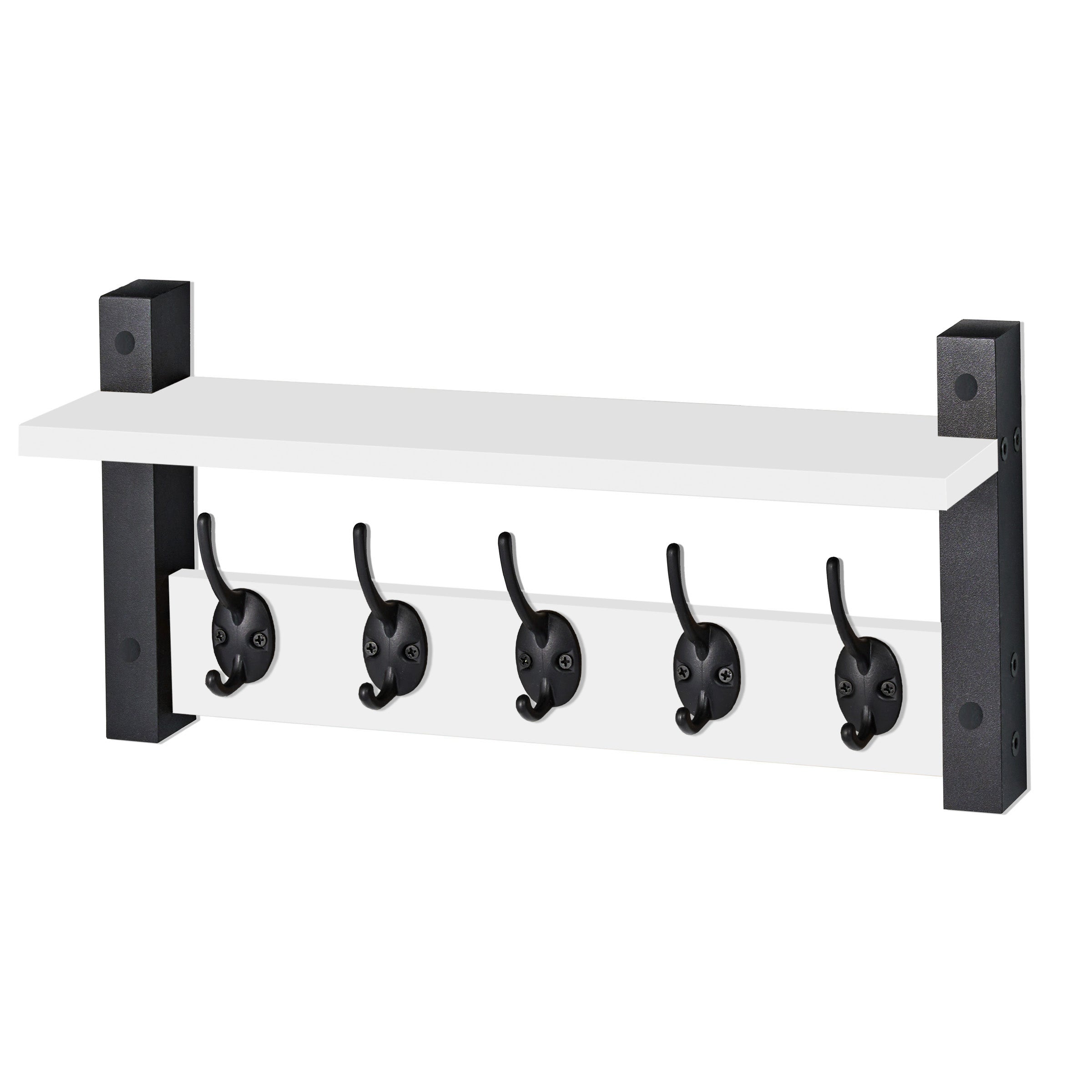 Add both elegance & everyday function to your walls with this wall mount floating shelf with 5 hooks. Designed with versatility in mind, this sleek & compact wall rack accordion wall hanger hook rack makes the perfect addition to your entryway, bathroom, kitchen, mudroom, or even bedroom. The shelf is deep enough to hold picture frames, candles, or a small potted plant, while the 5 heavy-duty metal hooks offer ample hanging storage for coats, scarves, bags, or hats.
