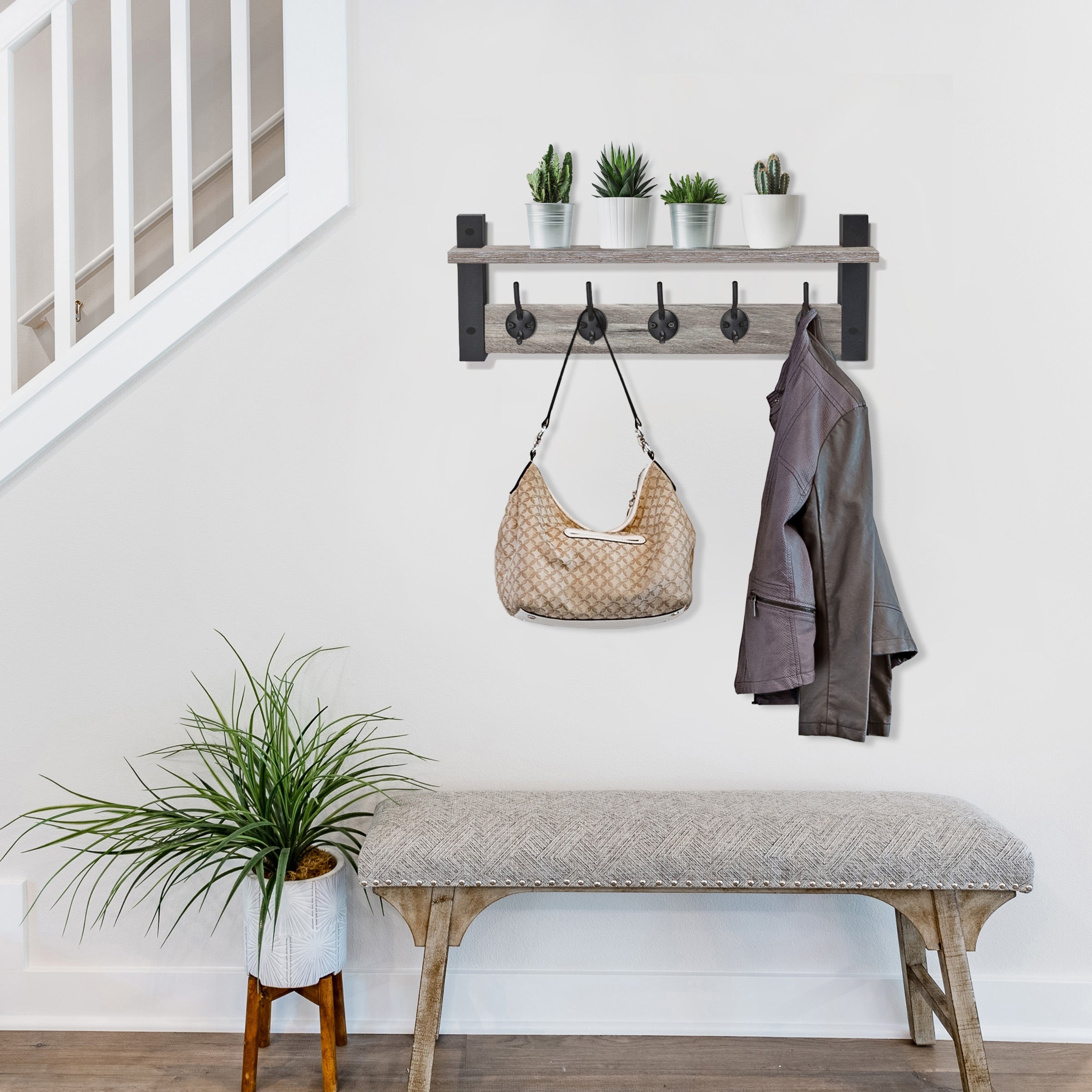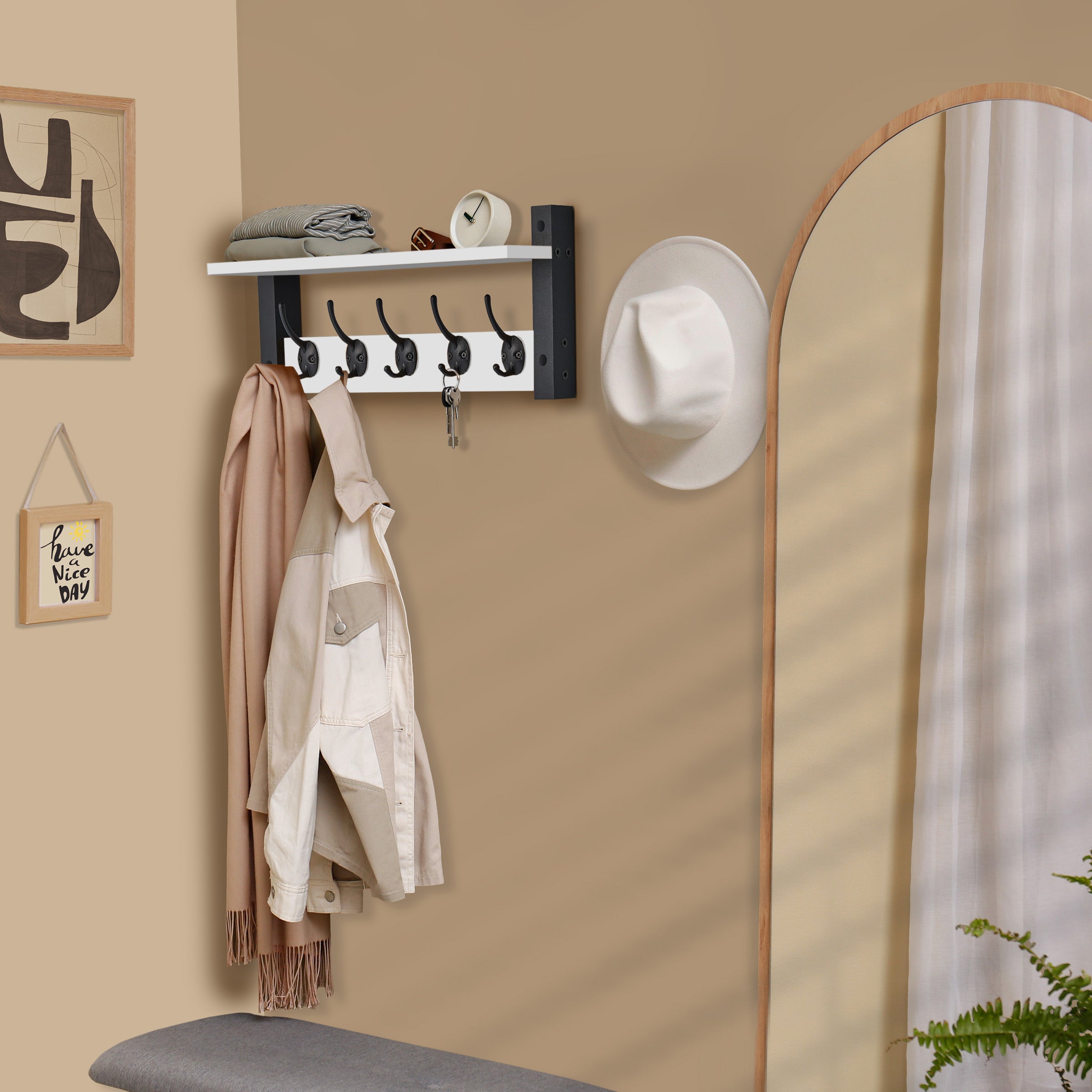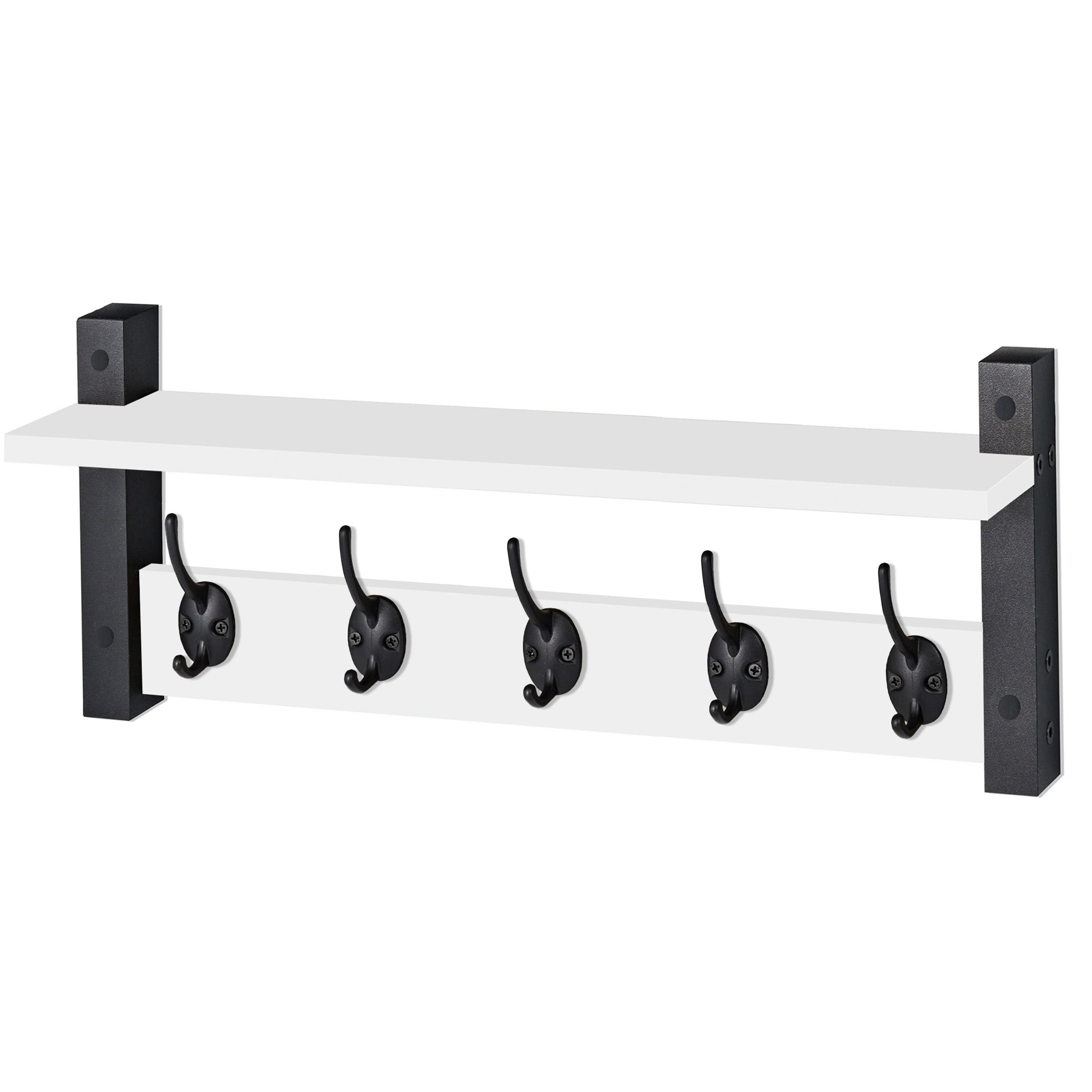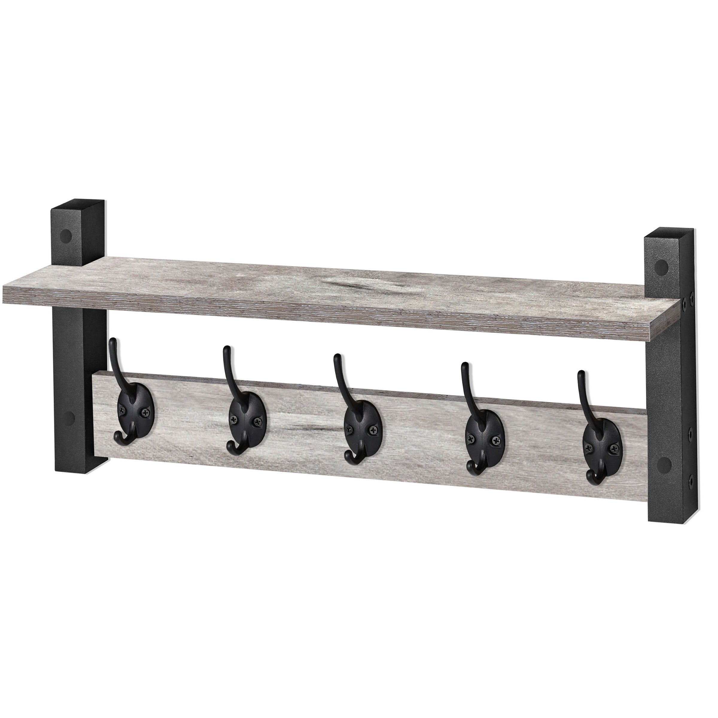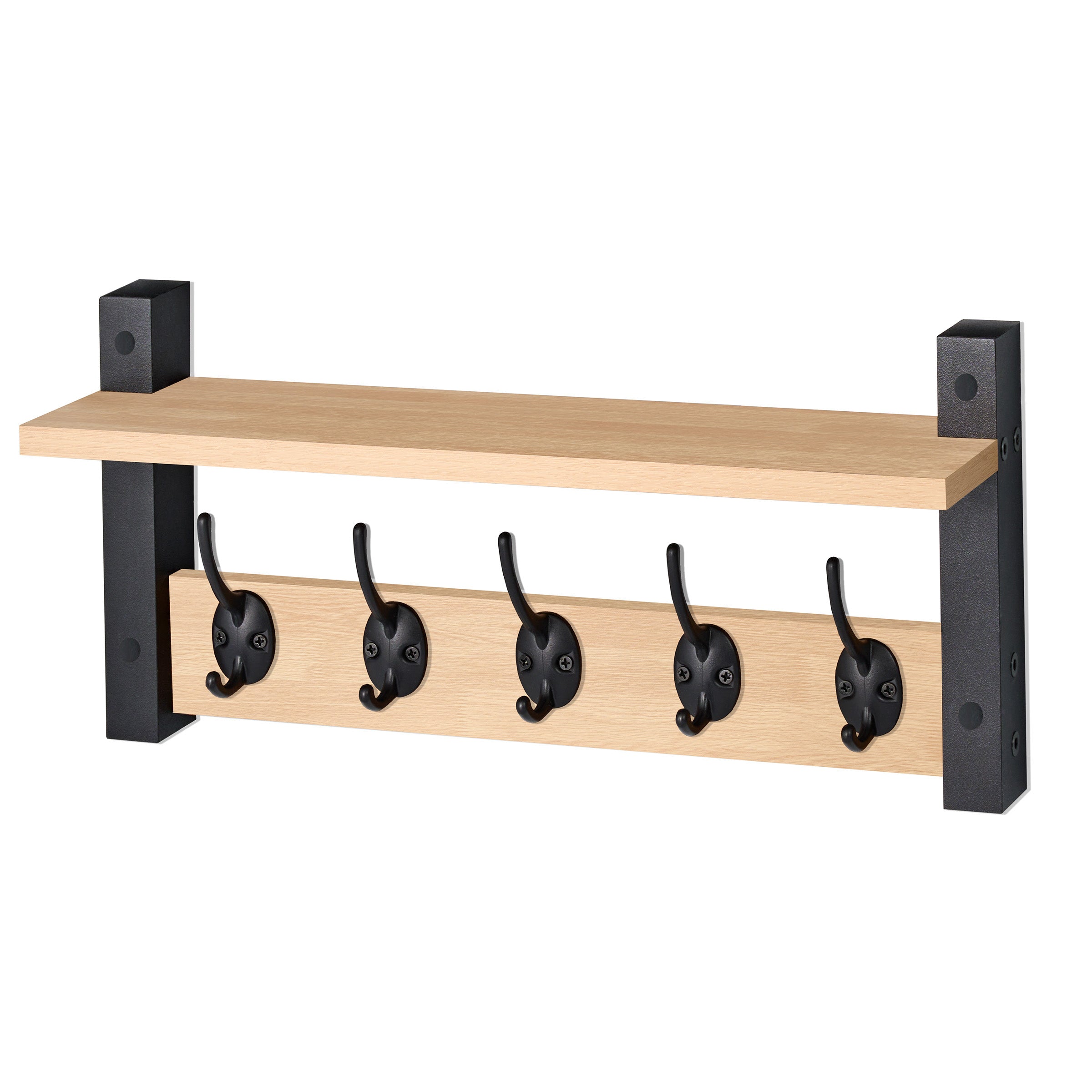 Add both elegance & everyday function to your walls with this wall mount floating shelf with 5 hooks. Designed with versatility in mind, this sleek & compact wall rack accordion wall hanger hook rack makes the perfect addition to your entryway, bathroom, kitchen, mudroom, or even bedroom. The shelf is deep enough to hold picture frames, candles, or a small potted plant, while the 5 heavy-duty metal hooks offer ample hanging storage for coats, scarves, bags, or hats.