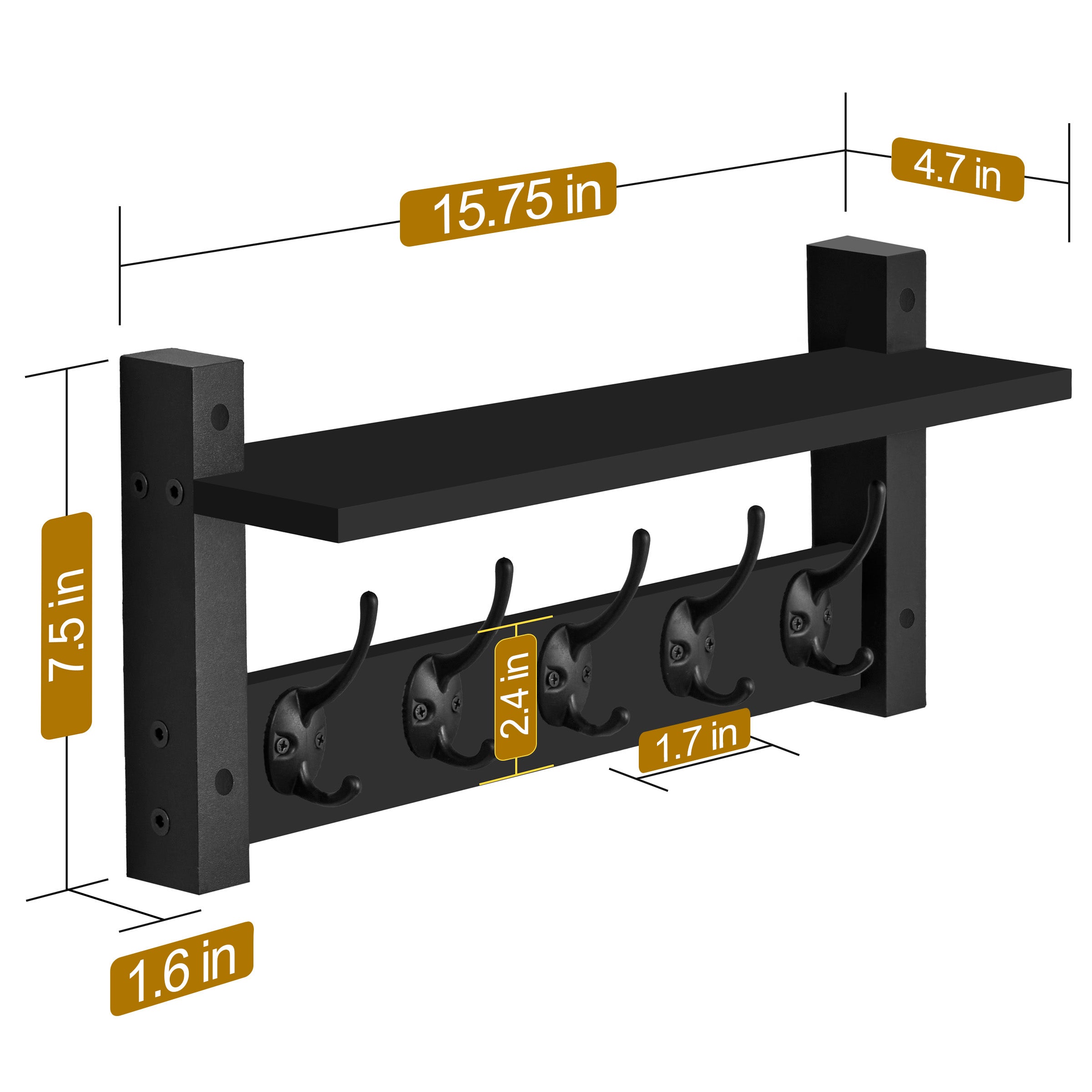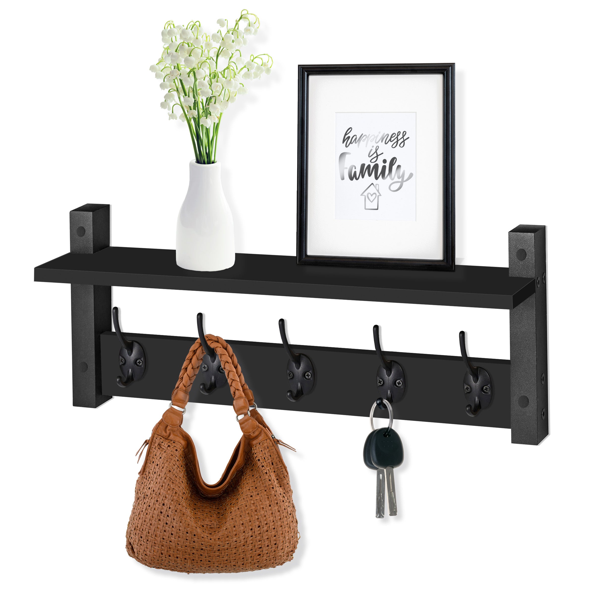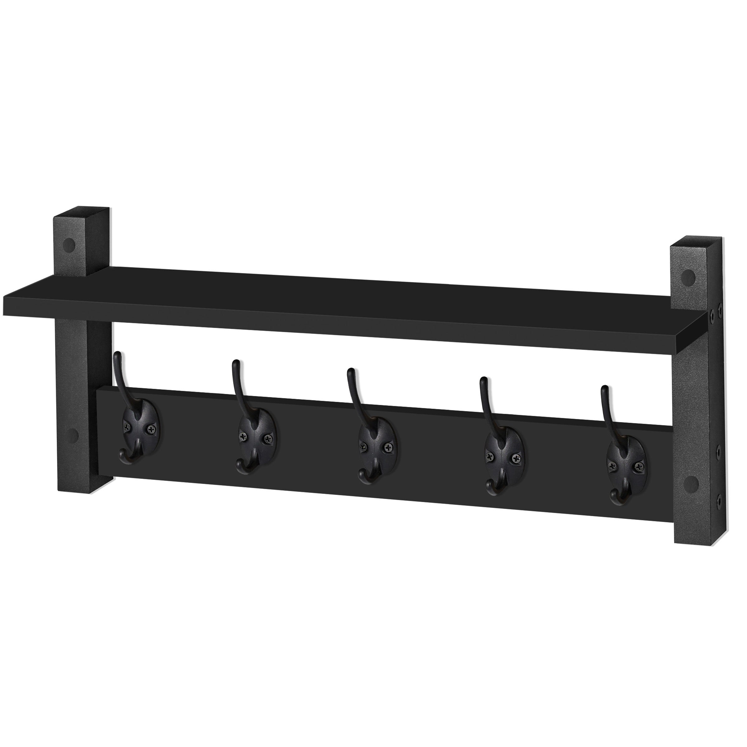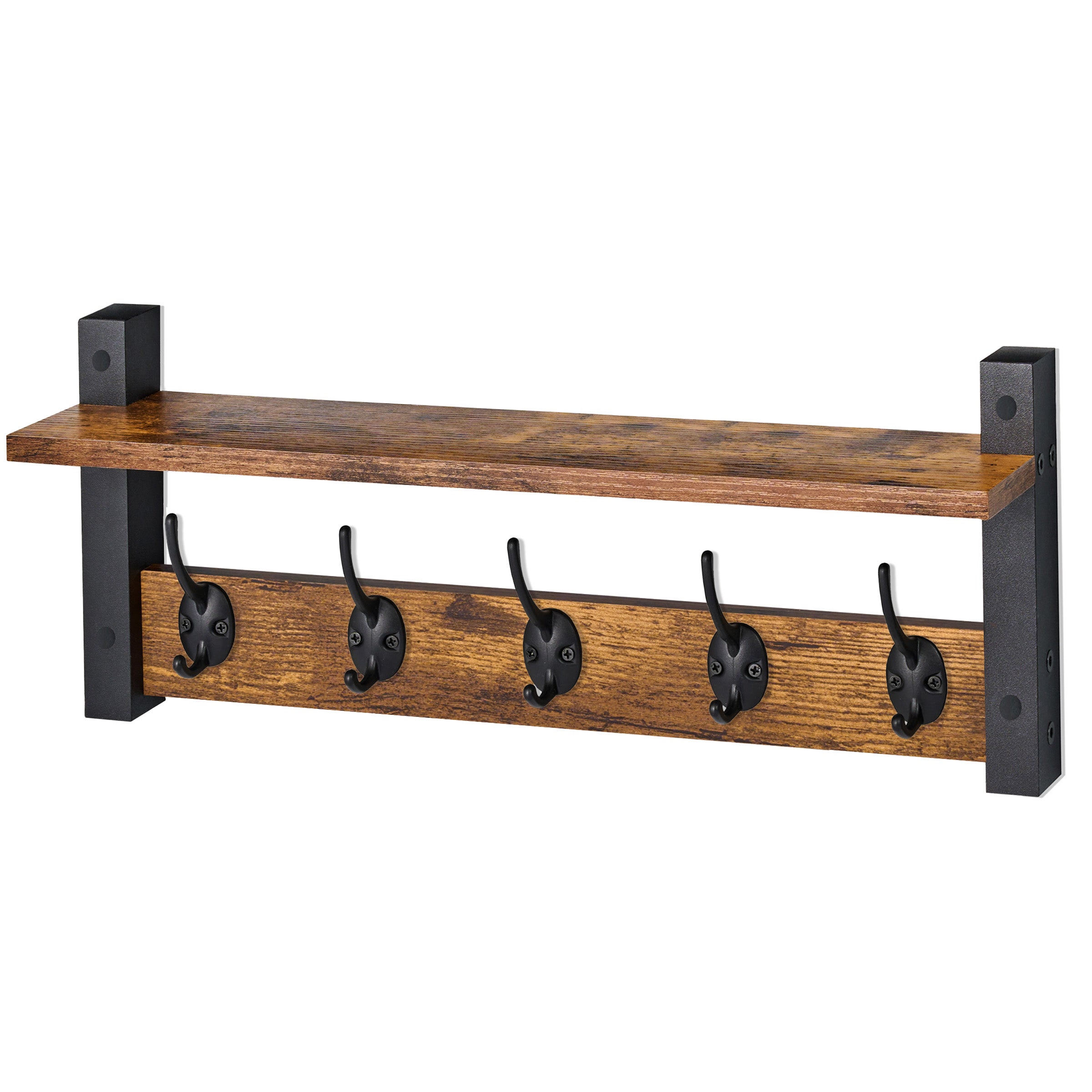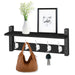 Add both elegance & everyday function to your walls with this wall mount floating shelf with 5 hooks. Designed with versatility in mind, this sleek & compact wall rack accordion wall hanger hook rack makes the perfect addition to your entryway, bathroom, kitchen, mudroom, or even bedroom. The shelf is deep enough to hold picture frames, candles, or a small potted plant, while the 5 heavy-duty metal hooks offer ample hanging storage for coats, scarves, bags, or hats.