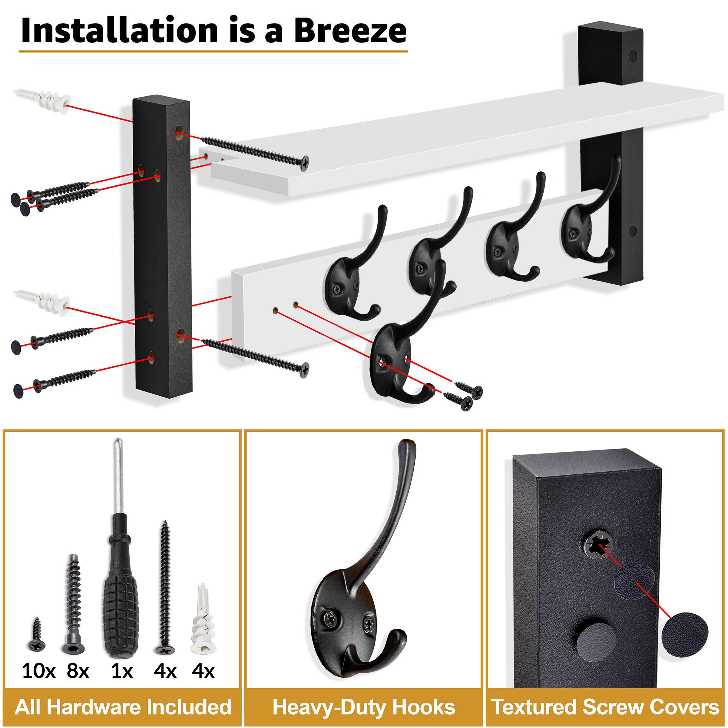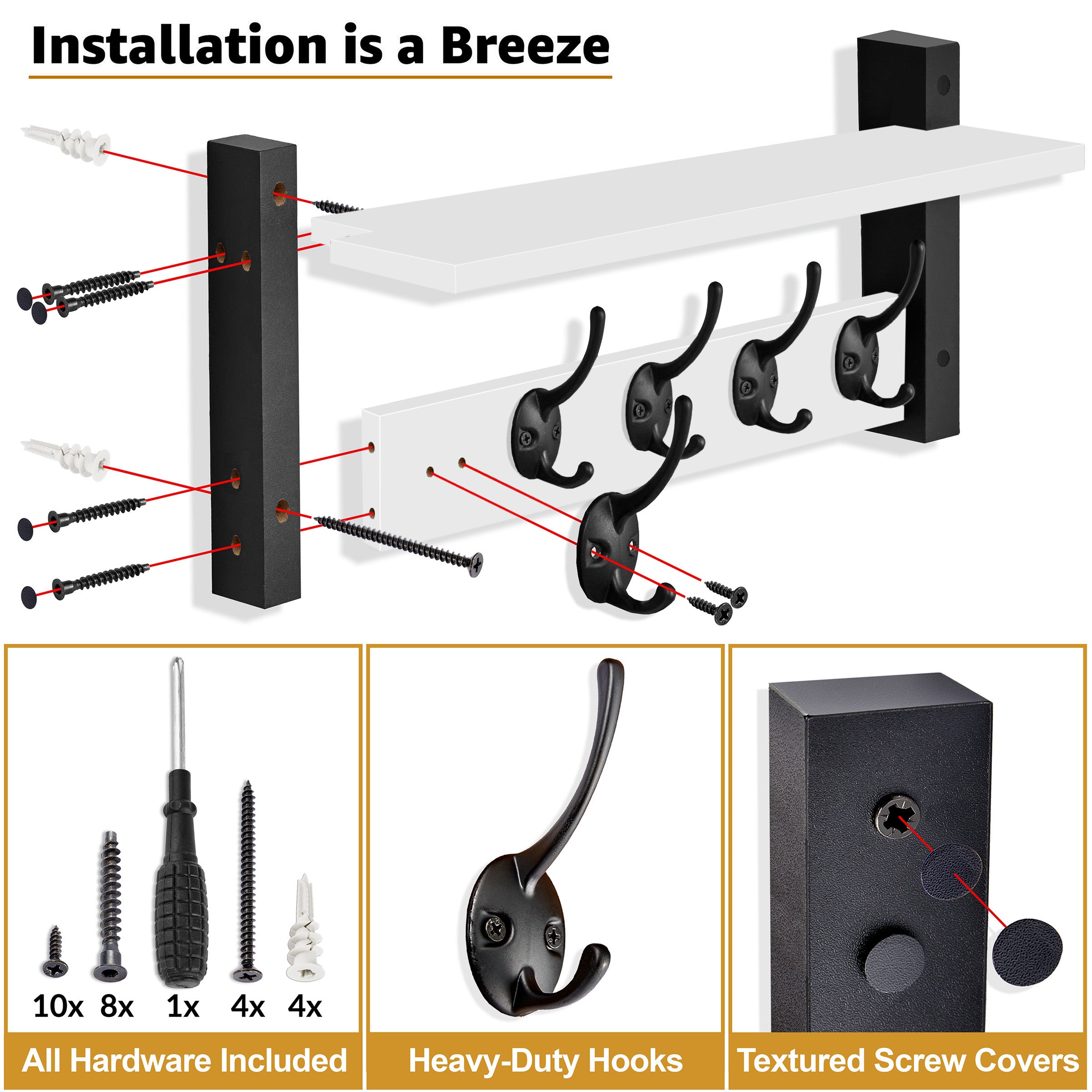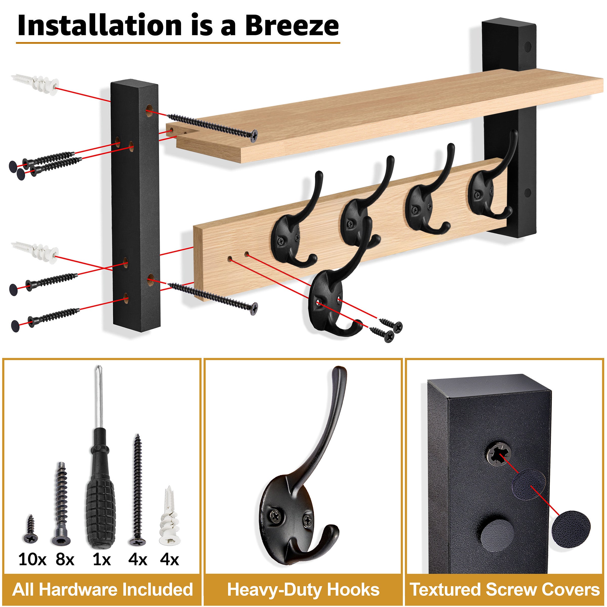 With large and extra-large options measuring 15.75" W x 4.7" D x 7.5" H, and 23.6" W x 4.7" D x 7.5" H, the backpack hanger & wall mount hooks bar fits comfortably in narrow or vertical spaces. No need for drill, our shelves are super easy to assemble, and the package comes with all tools and parts along with installation instructions.