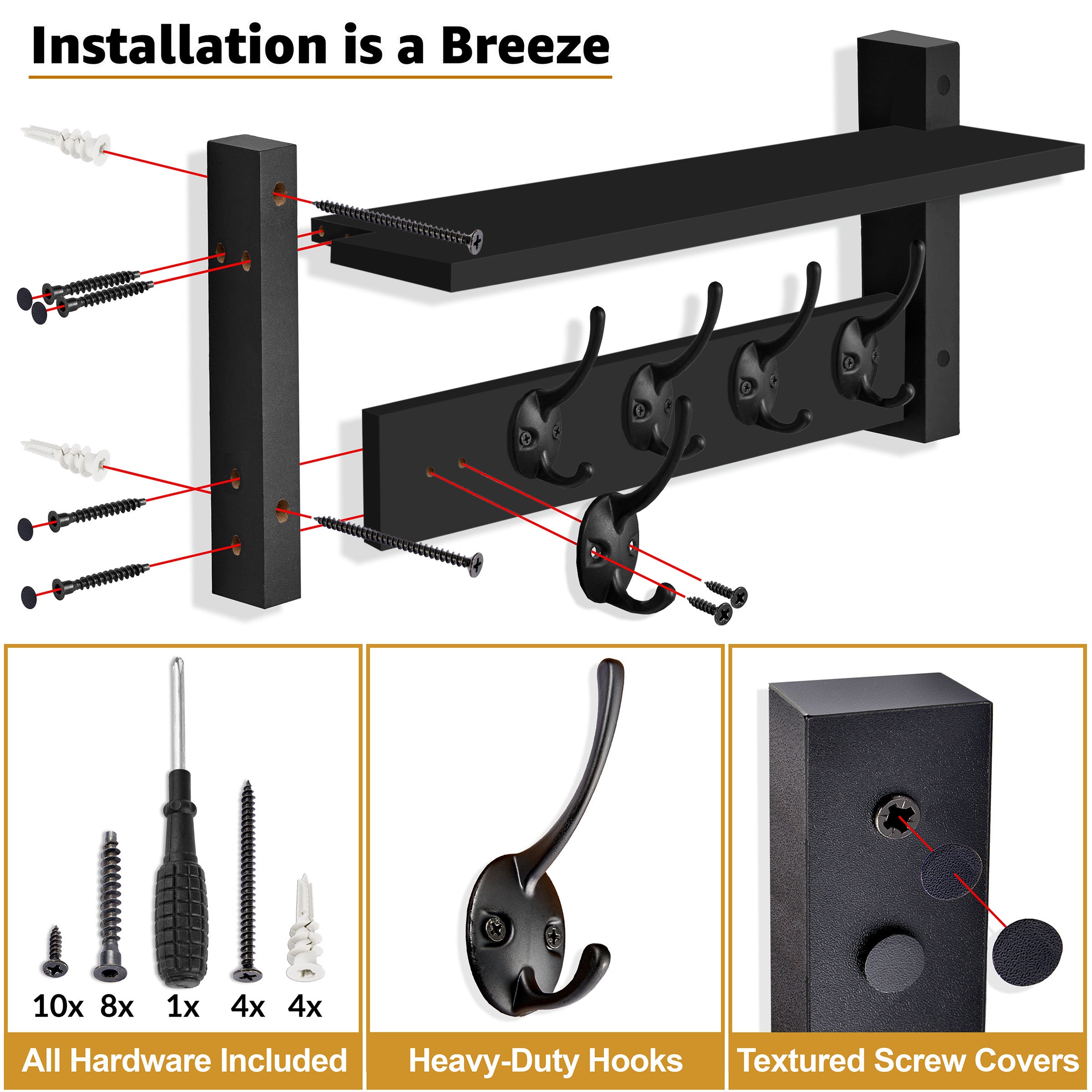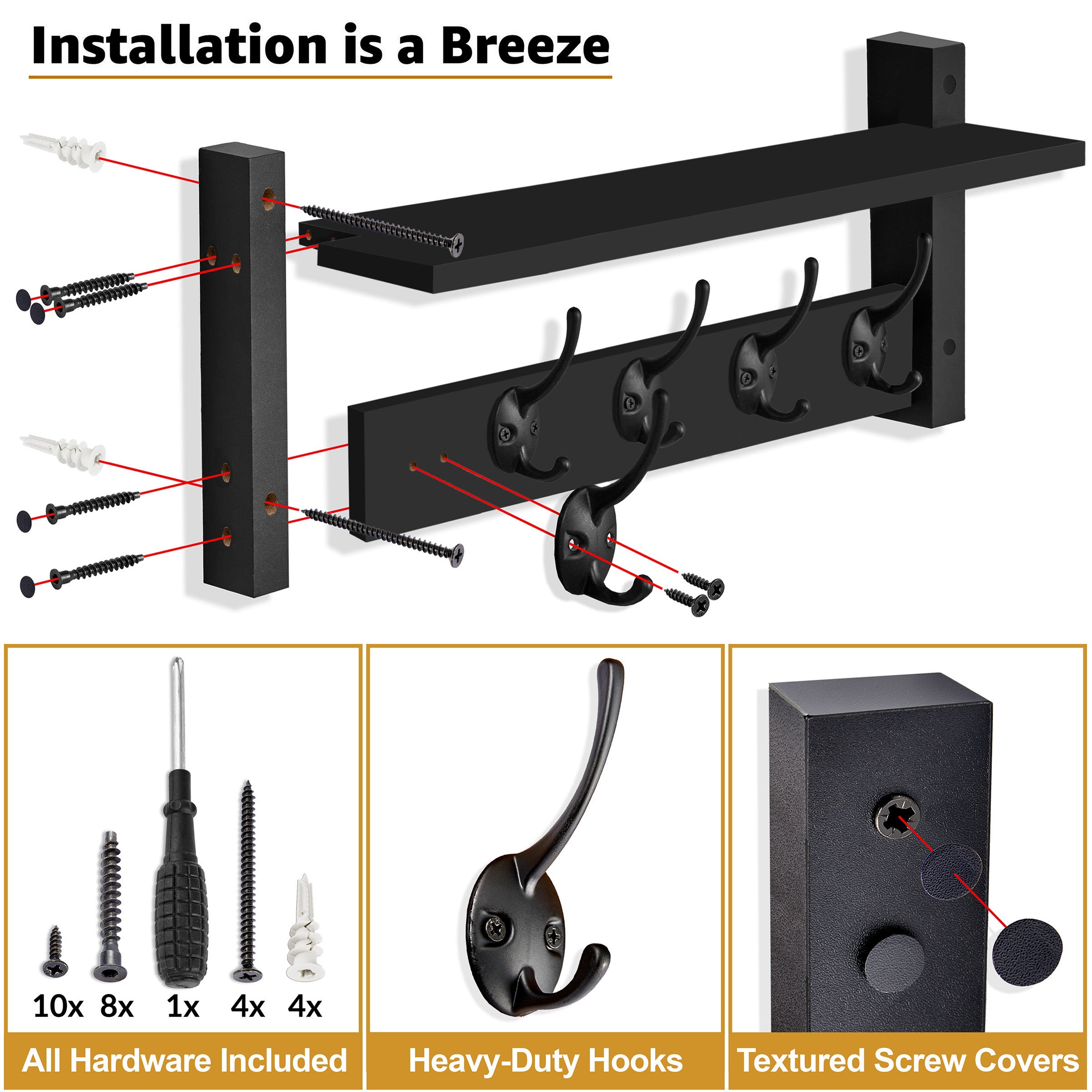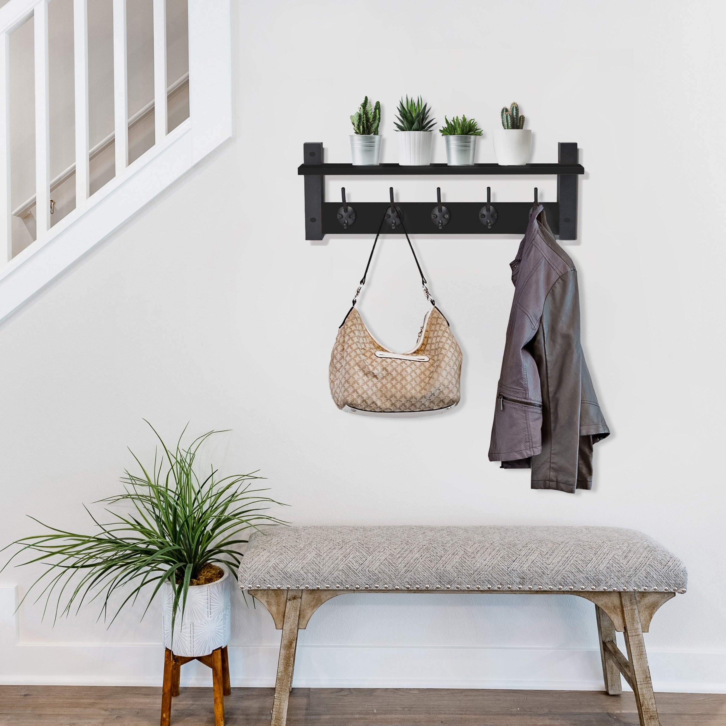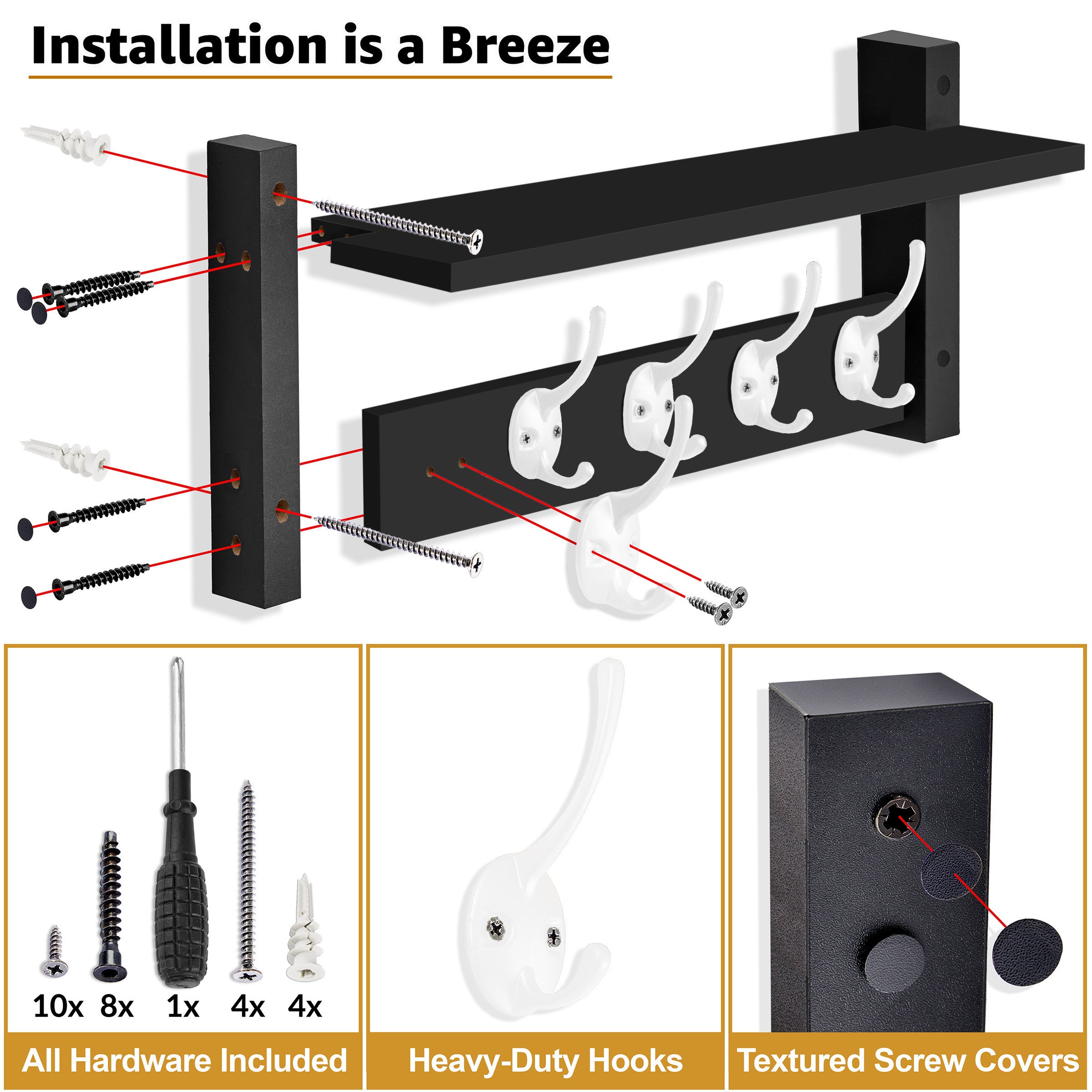 Crafted from durable engineered wood & coated in a classic matte black finish, this entryway hooks & entryway coat rack complements a variety of interior styles—from modern & industrial to rustic & farmhouse. The thoughtful design includes textured screw covers for a seamless look & all installation hardware is included, making setup quick & hassle-free.