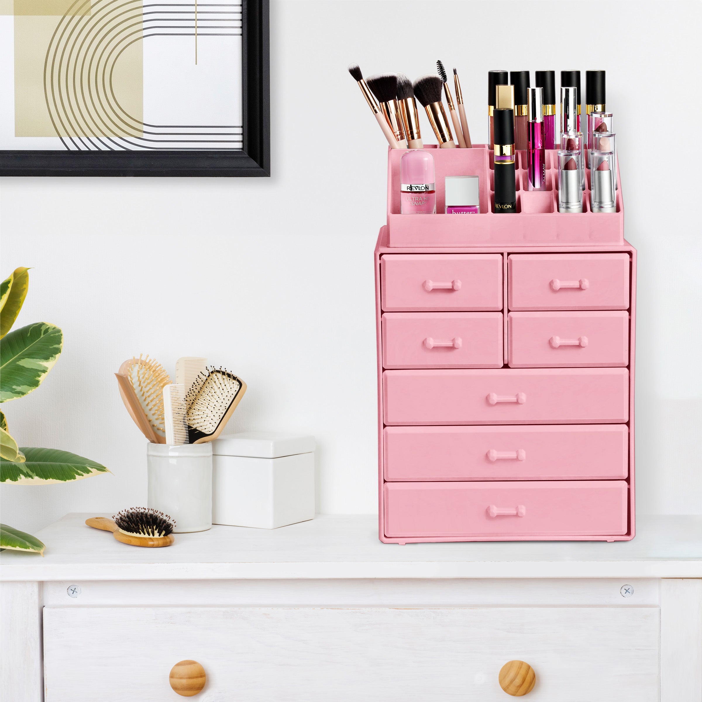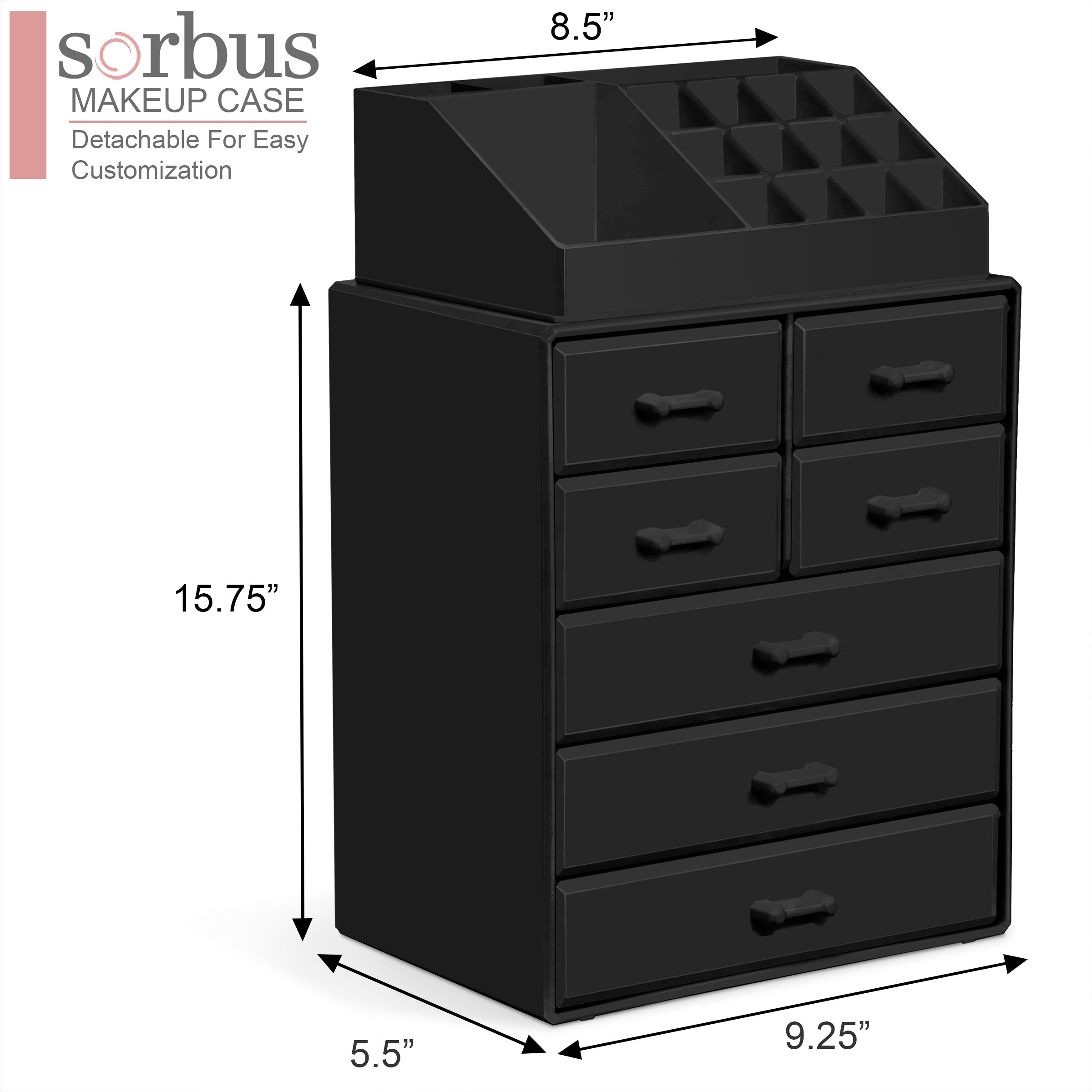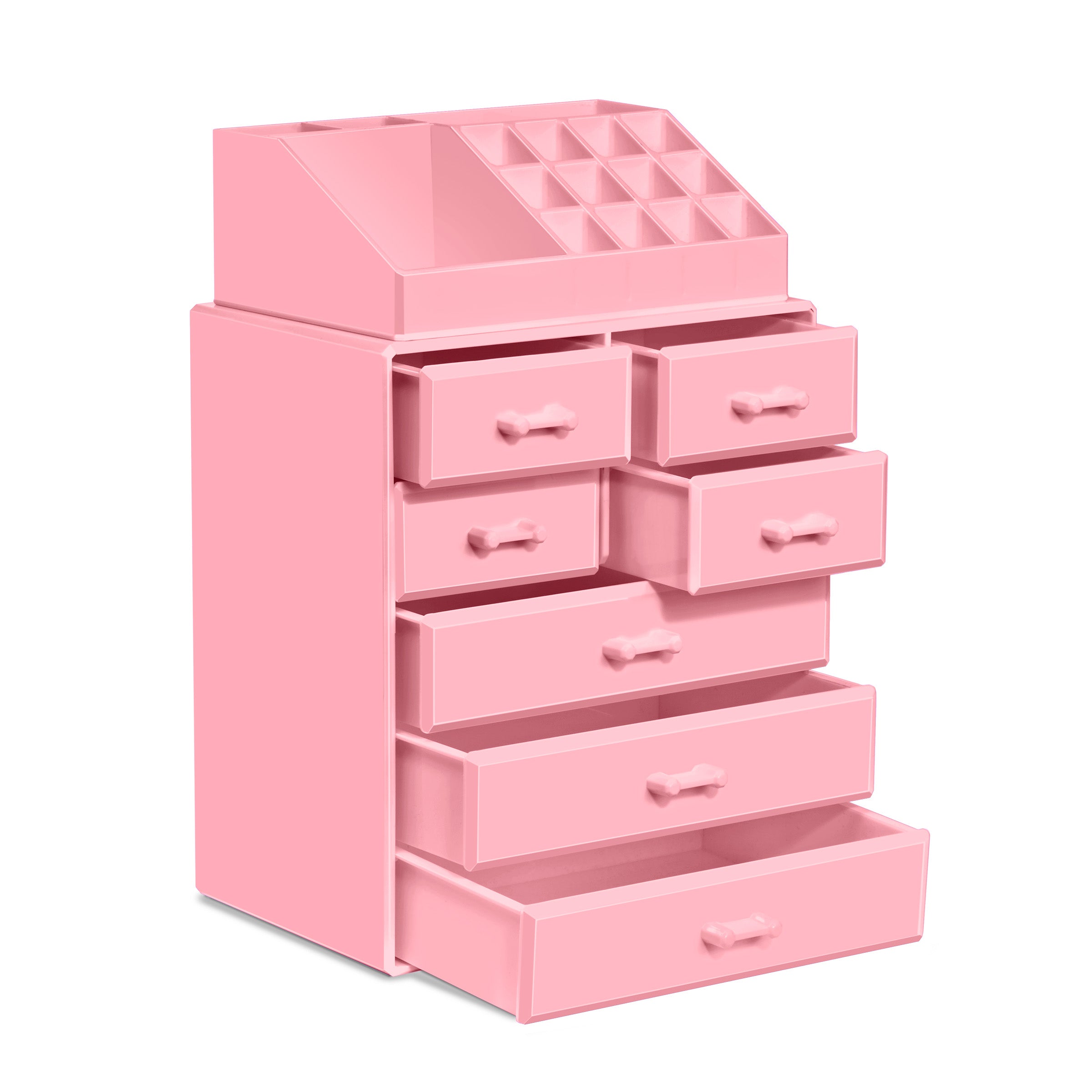 Cosmetic display makeup and jewelry organizer has an acrylic construction that comes with 4 drawers. Bottom unit ideal for oversize cosmetics toiletries, top two drawers hold items, 16 slots portion ideal for brushes, lipsticks, eye pencils, perfume, bottles in the protected drawers perfect storing palettes, foundations, bronzers, blushes, primers, powders, jewelry, accessories collection. The functional stylish display acrylic makeup organizer can be used at home or for professional use. Add display dresser or countertop while bringing ease and convenience to everyday routine.