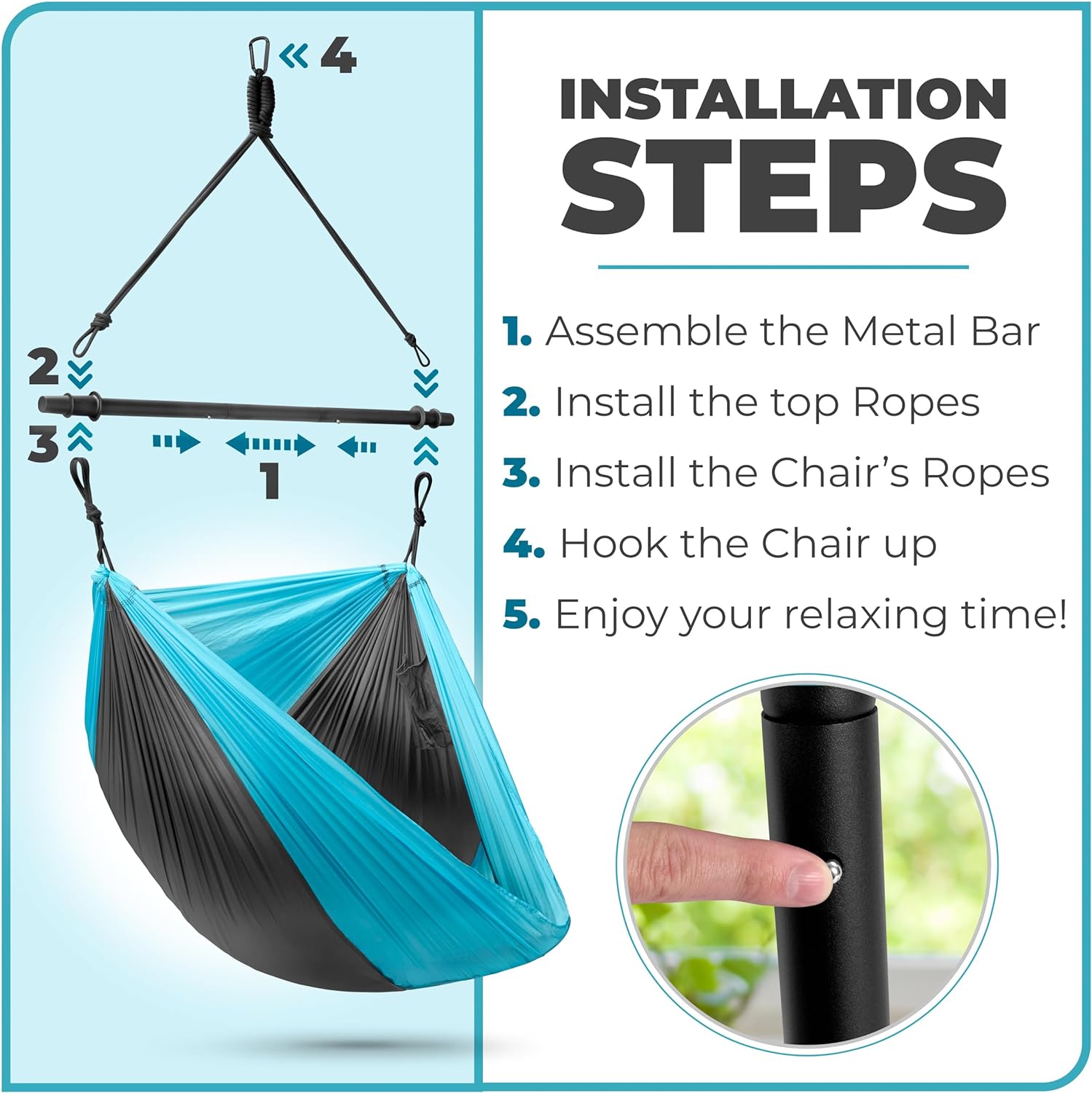 Versatile for both indoor and outdoor use, the hammock swing chair can be folded into a compact size of 15 x 6.3 inches and stored in the included small storage bag, which fits easily into your backpack. Weighing under 4 pounds, it is highly portable. The chair is built to last with durable woven ropes, sturdy nylon seat material, and an iron support rod, offering a weight capacity of up to 500 pounds. Metal anti-slip rings ensure stability and balance at all times. Installation is a breeze: simply assemble the metal bar, install the support ropes, hook up your chair, and relax. Instructions are included for easy setup.