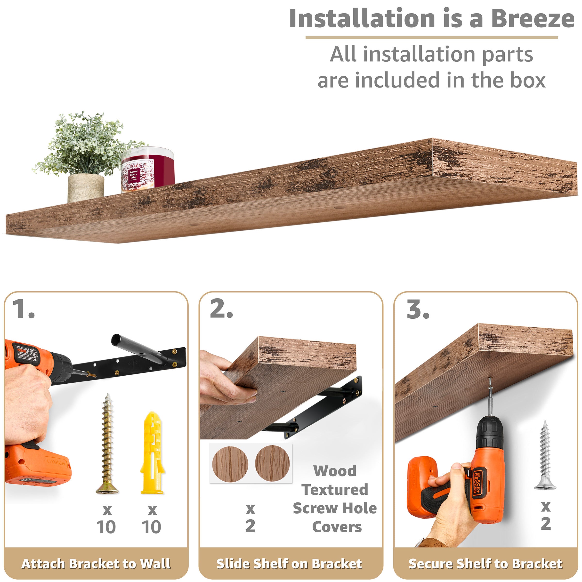• Each floating shelf measures approximately 9.25"L X 47” W X 1.5” H.