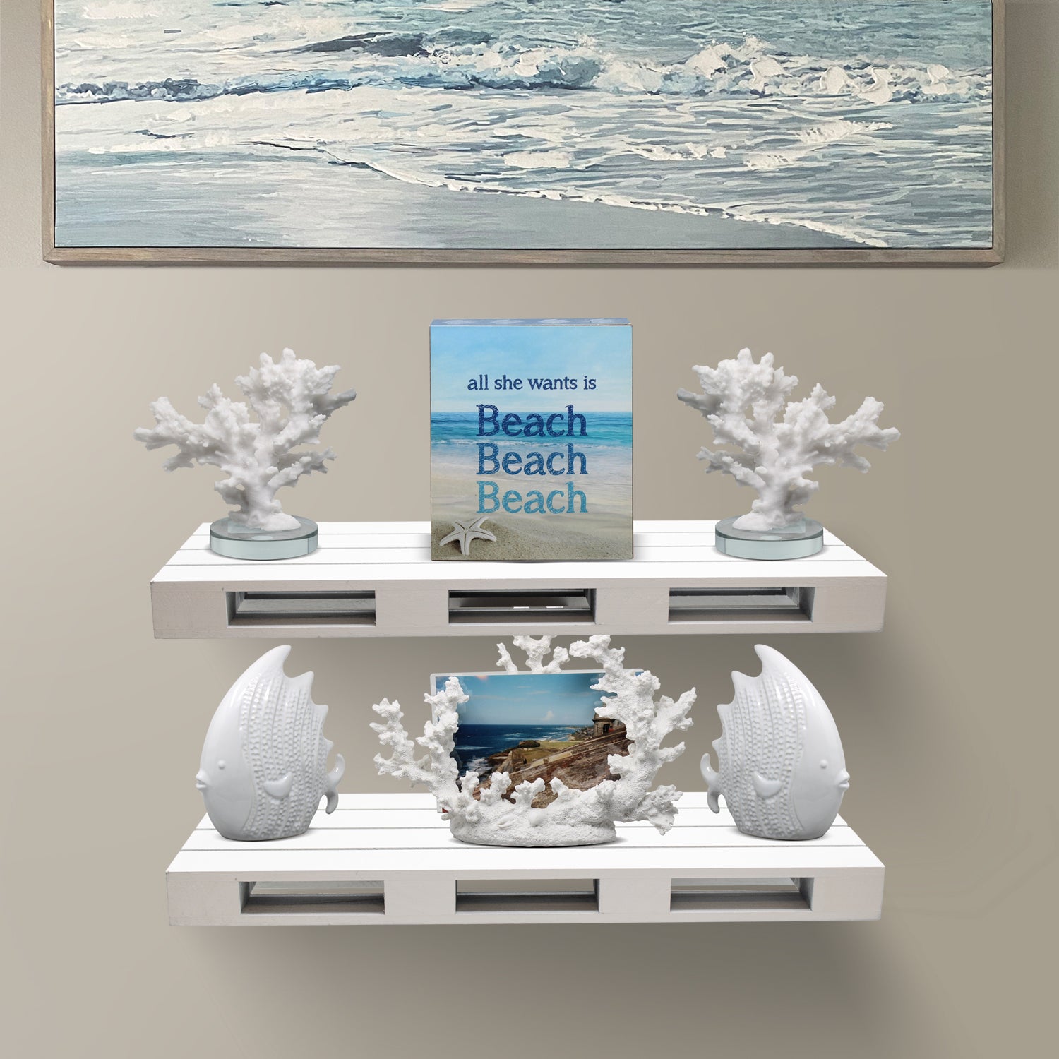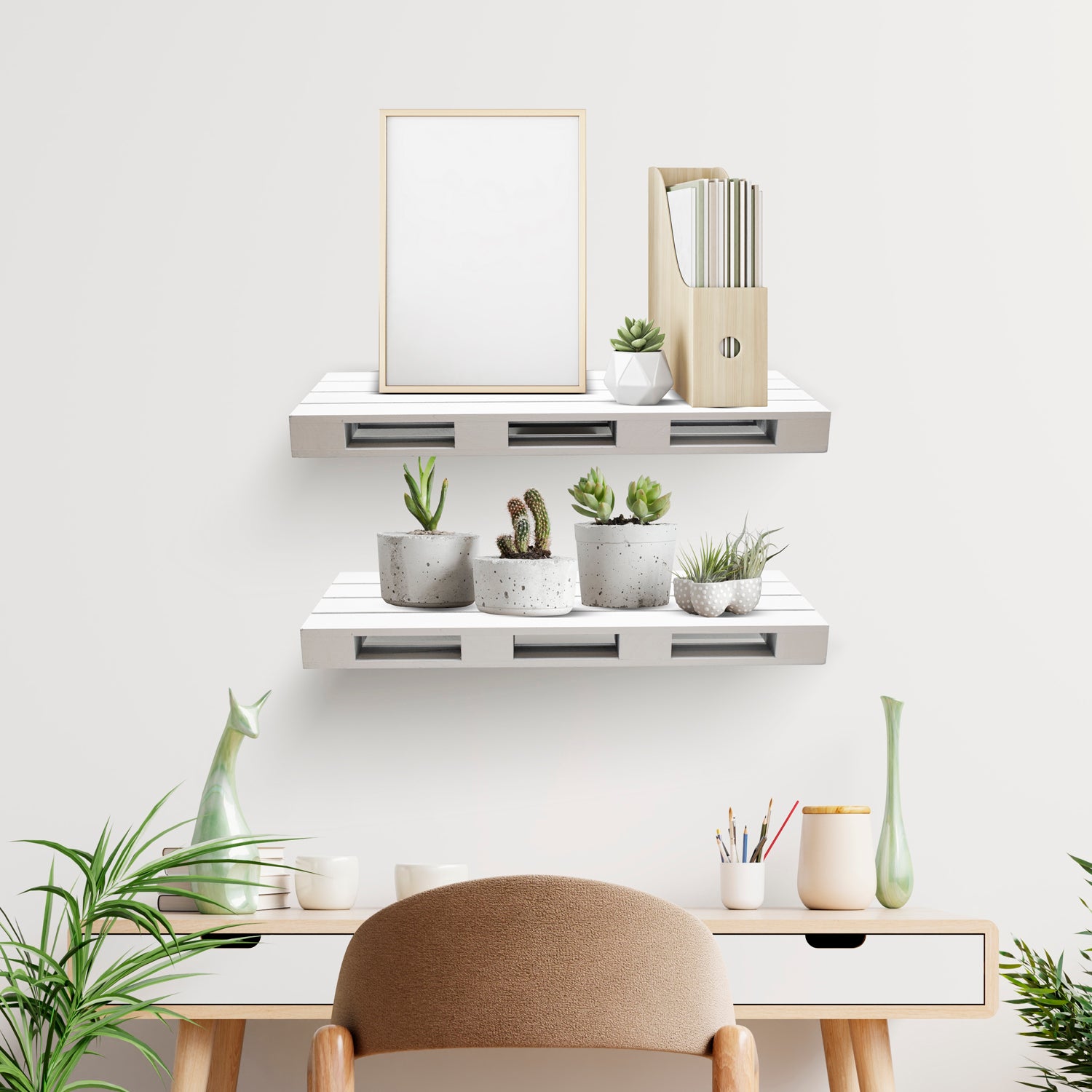 Display your favorite collectibles on these farmhouse style Floating Shelves with rustic appeal, this set of two shelf boards feature a rectangle design and distressed finish. Simply mount to any blank wall to maximize space for storage and display. Shelves can be hung at staggering heights for an energetic result or side-by-side for a streamlined look. Mounting hardware is included for stress-free installation! Whether for books in the nursery or home decor in the living room, hang anywhere as a charming wall feature.