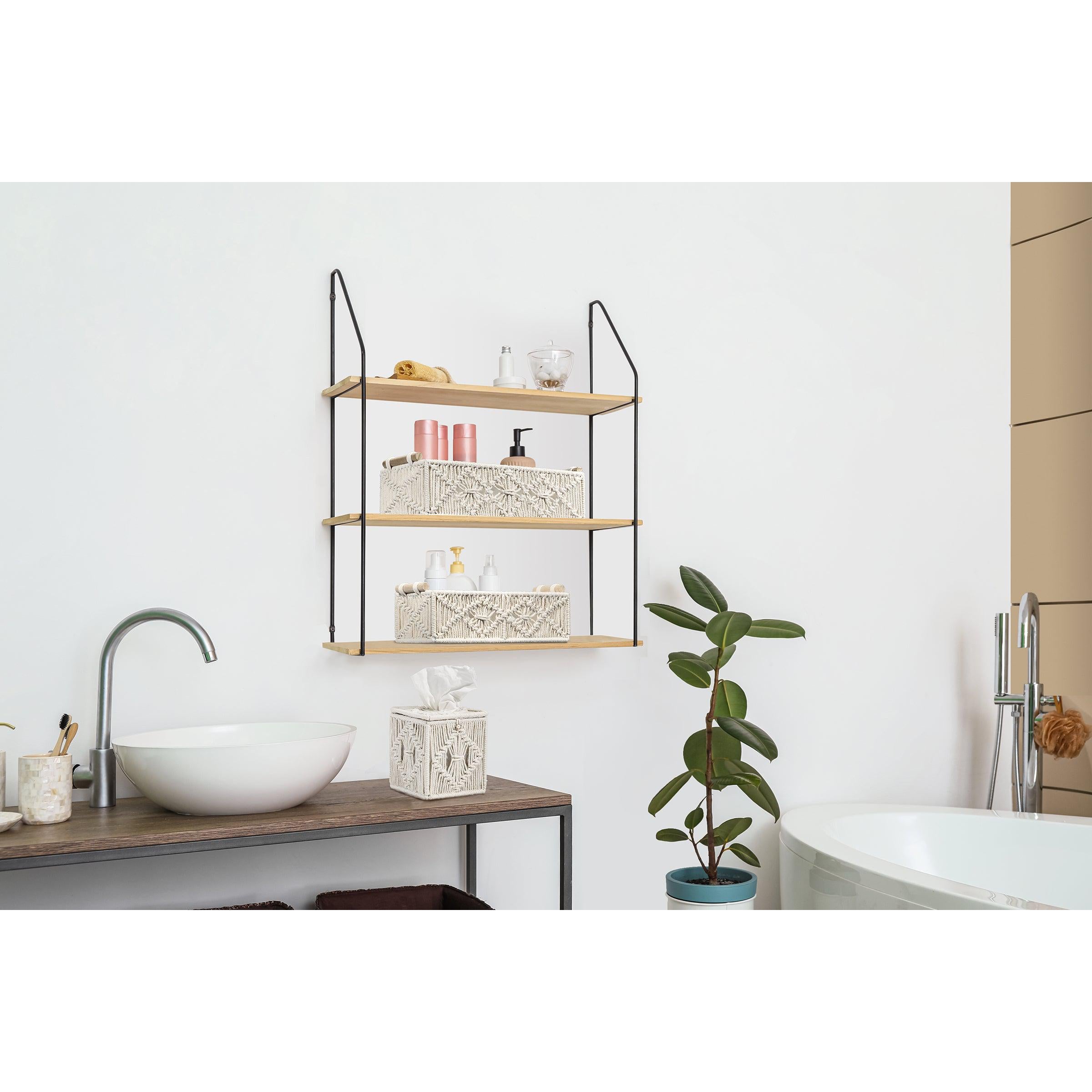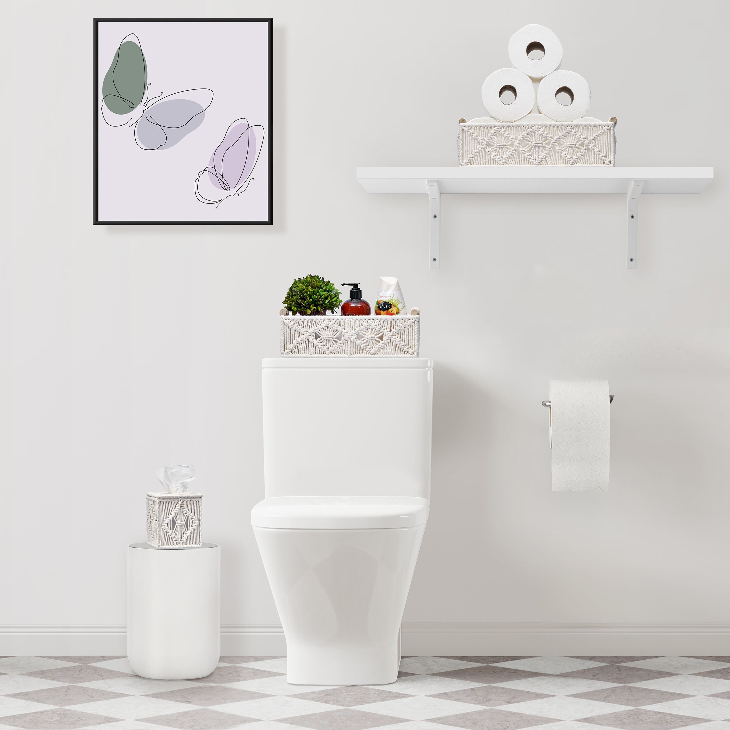 The Sorbus Macrame Bathroom Set is the perfect solution for keeping all your bathroom essentials organized. This set includes two lined storage baskets and one tissue holder, each featuring a paper role material and bohemian design. The compact design of the rectangular baskets allows them to fit perfectly on top of toilet tanks for easy bathroom organization. You can use them to organize washcloths, hand towels, toilet paper rolls, skincare, toiletries, hair accessories, makeup, bath products, and more. This matching set is the perfect way to complete your bathroom and organize your go-to items.