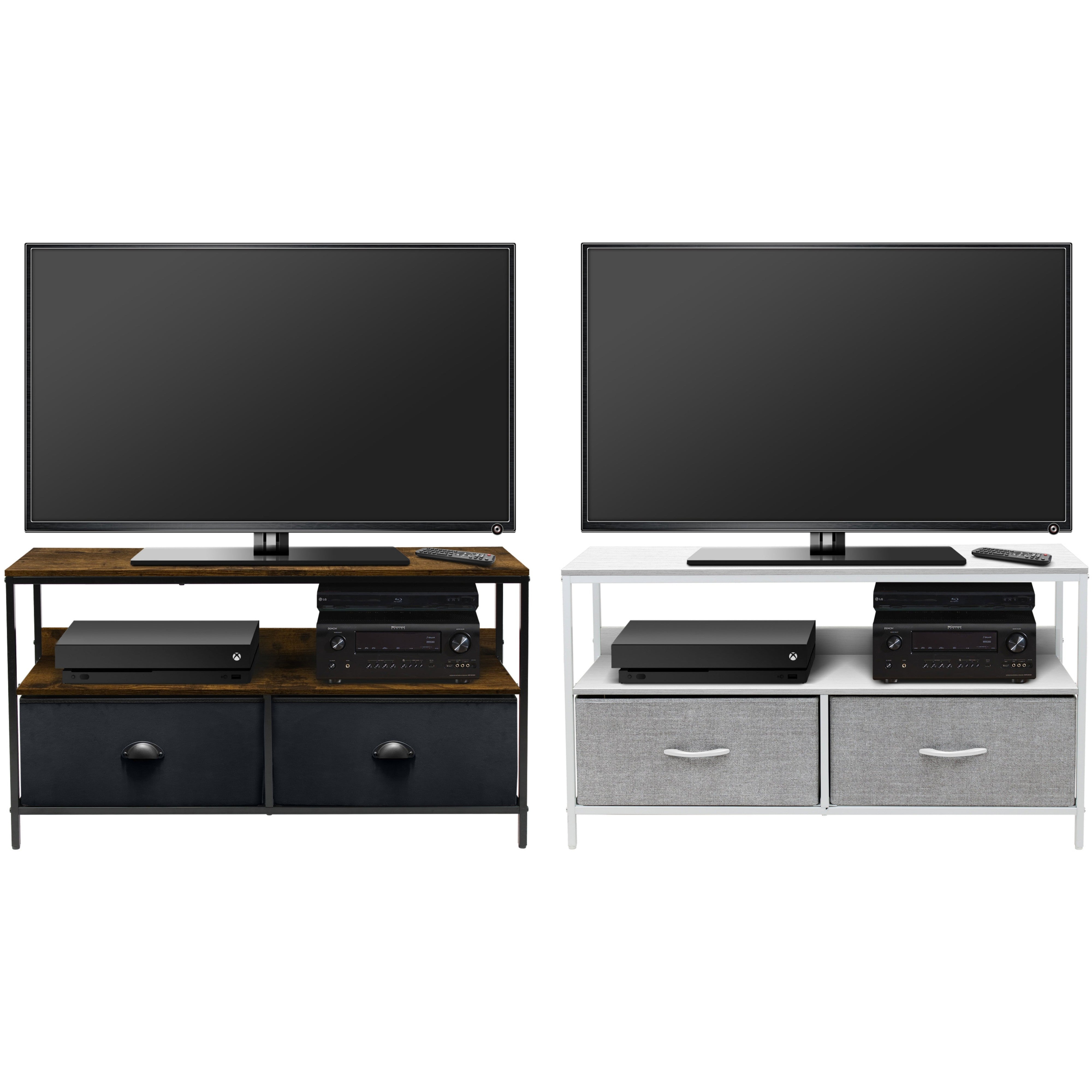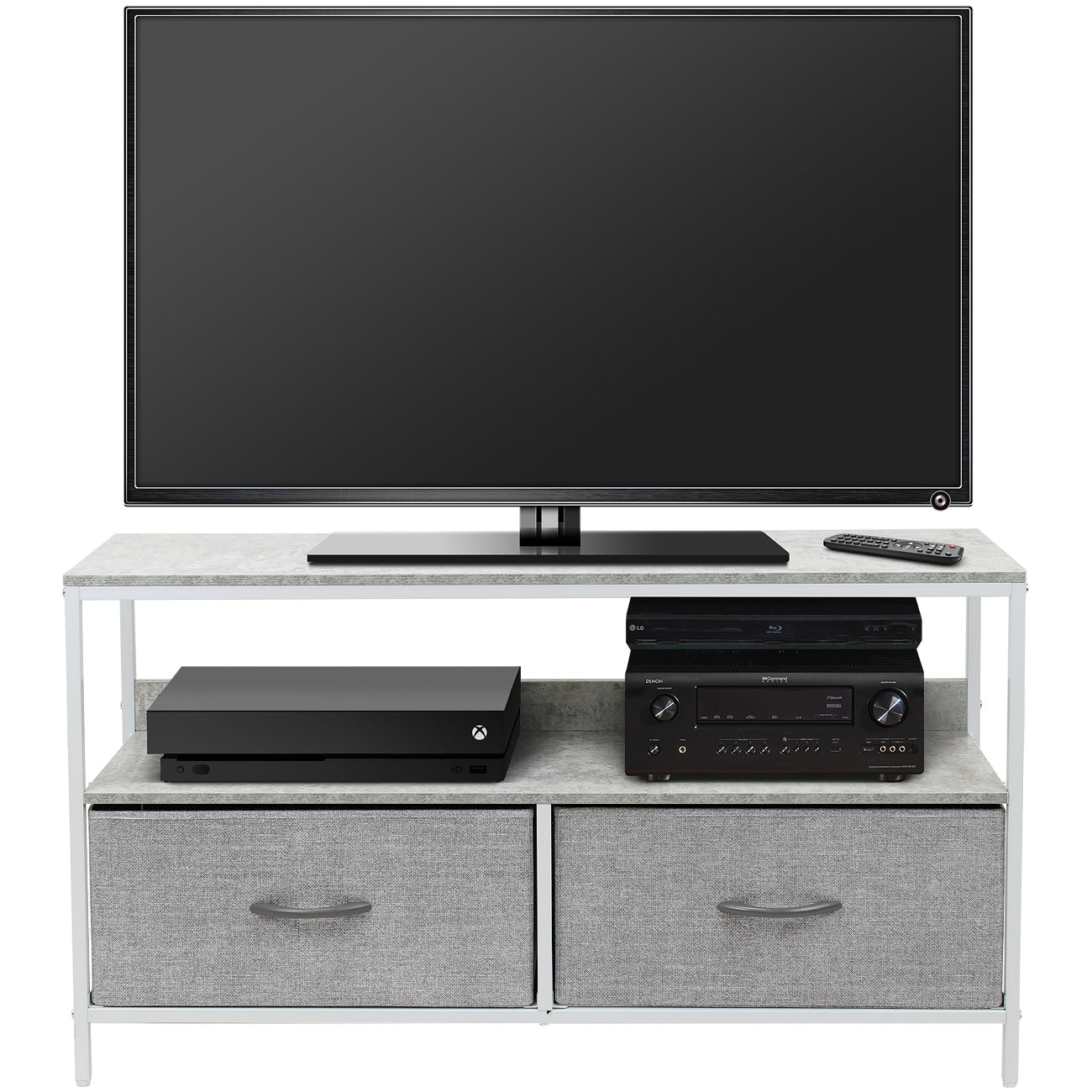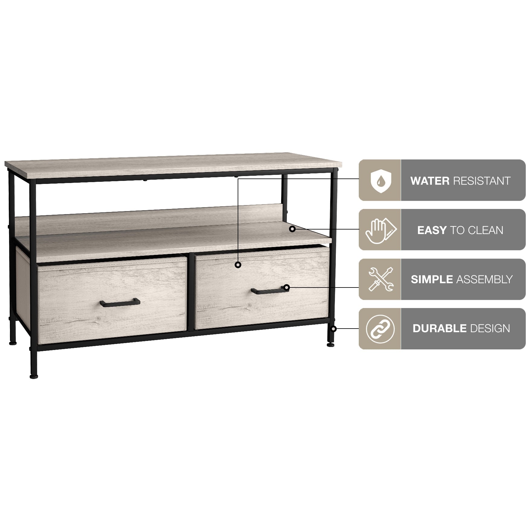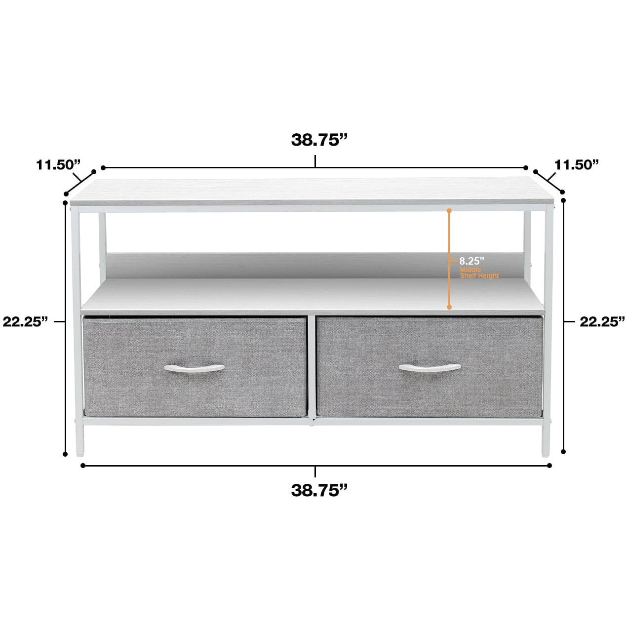 Organize and entertain with our TV Dresser Stand! Sleek and minimal, it features a faux wood top surface and strong steel frame. Two drawers pull out to reveal all your gadgets or everyday household items. Place anywhere from your living room, bedroom, or college dorm to get organized in style. The lightweight frame makes this unit easy to transport and when not in use, simply fold the fabric drawers flat for storage. Use alone or pair with similar styles from the Sorbus Furniture Collection.