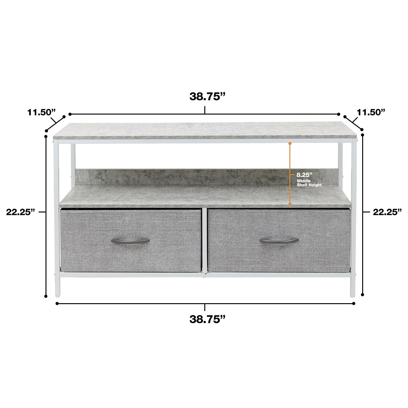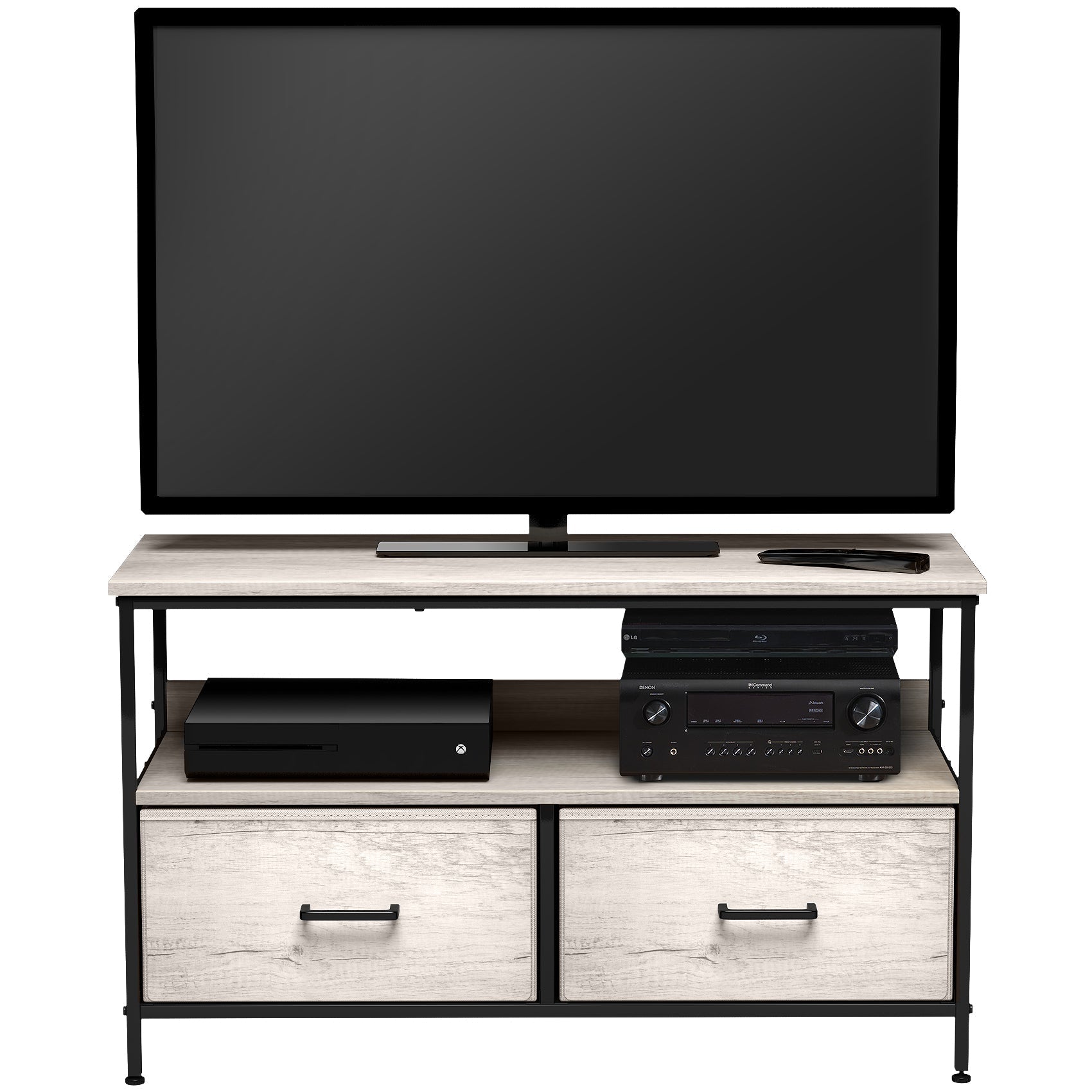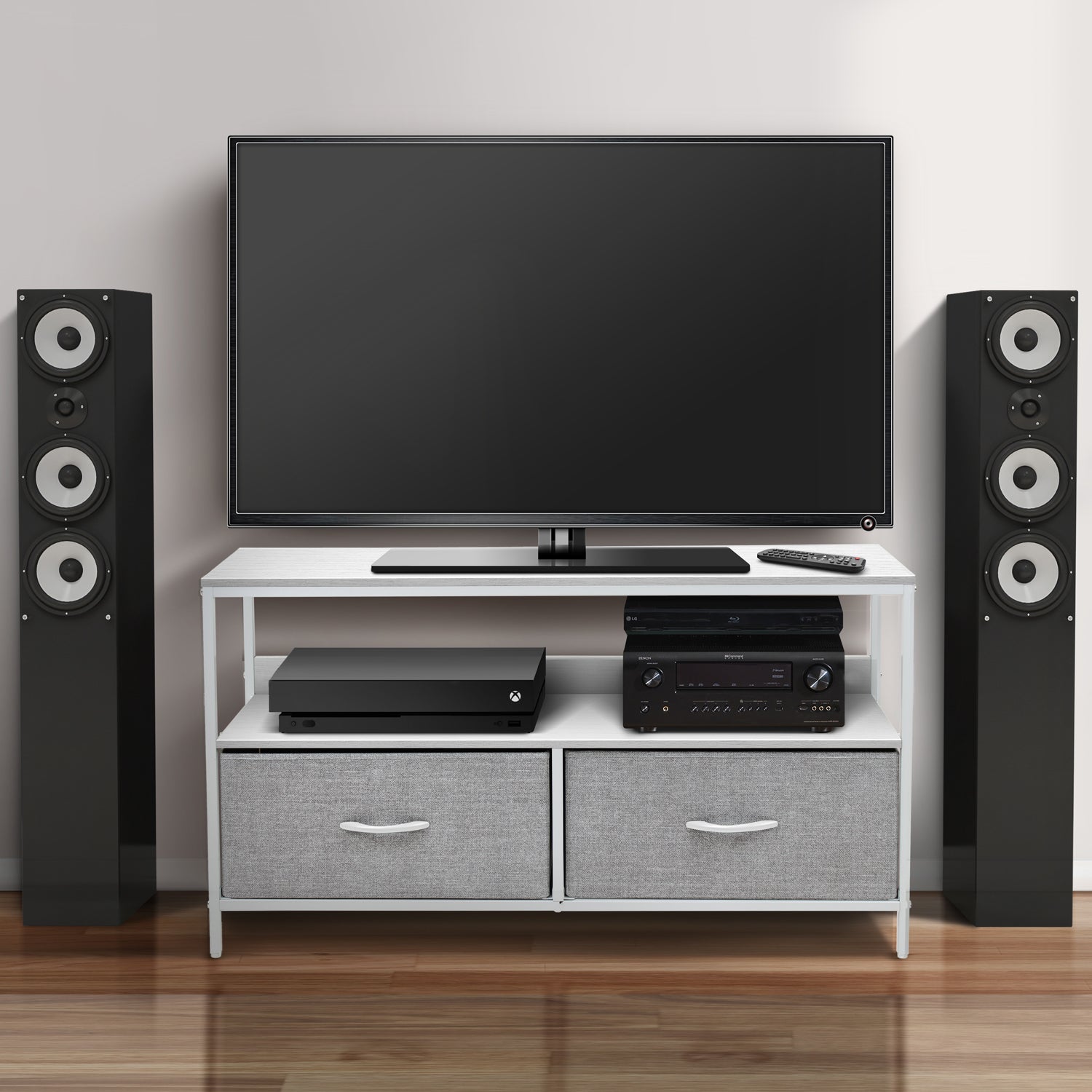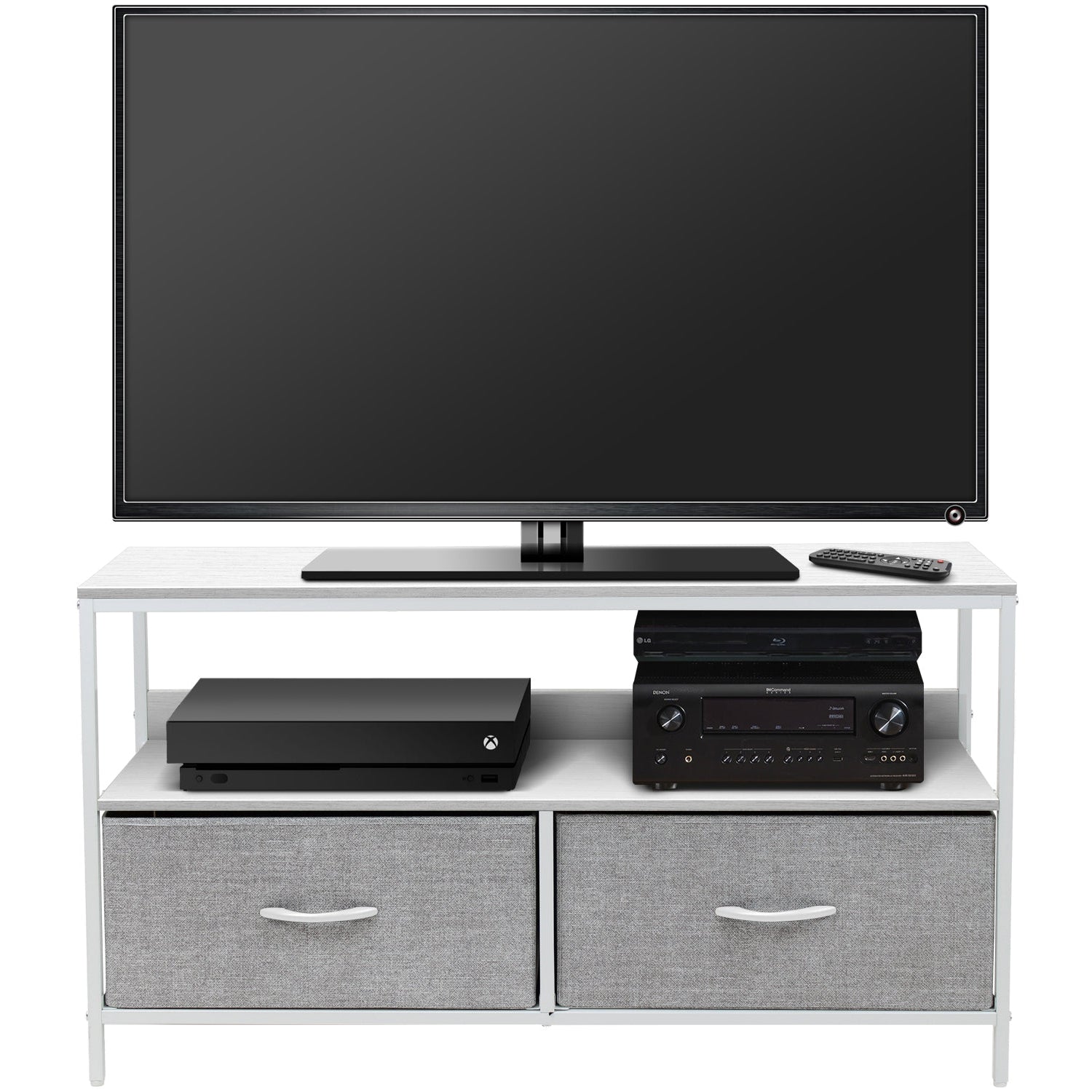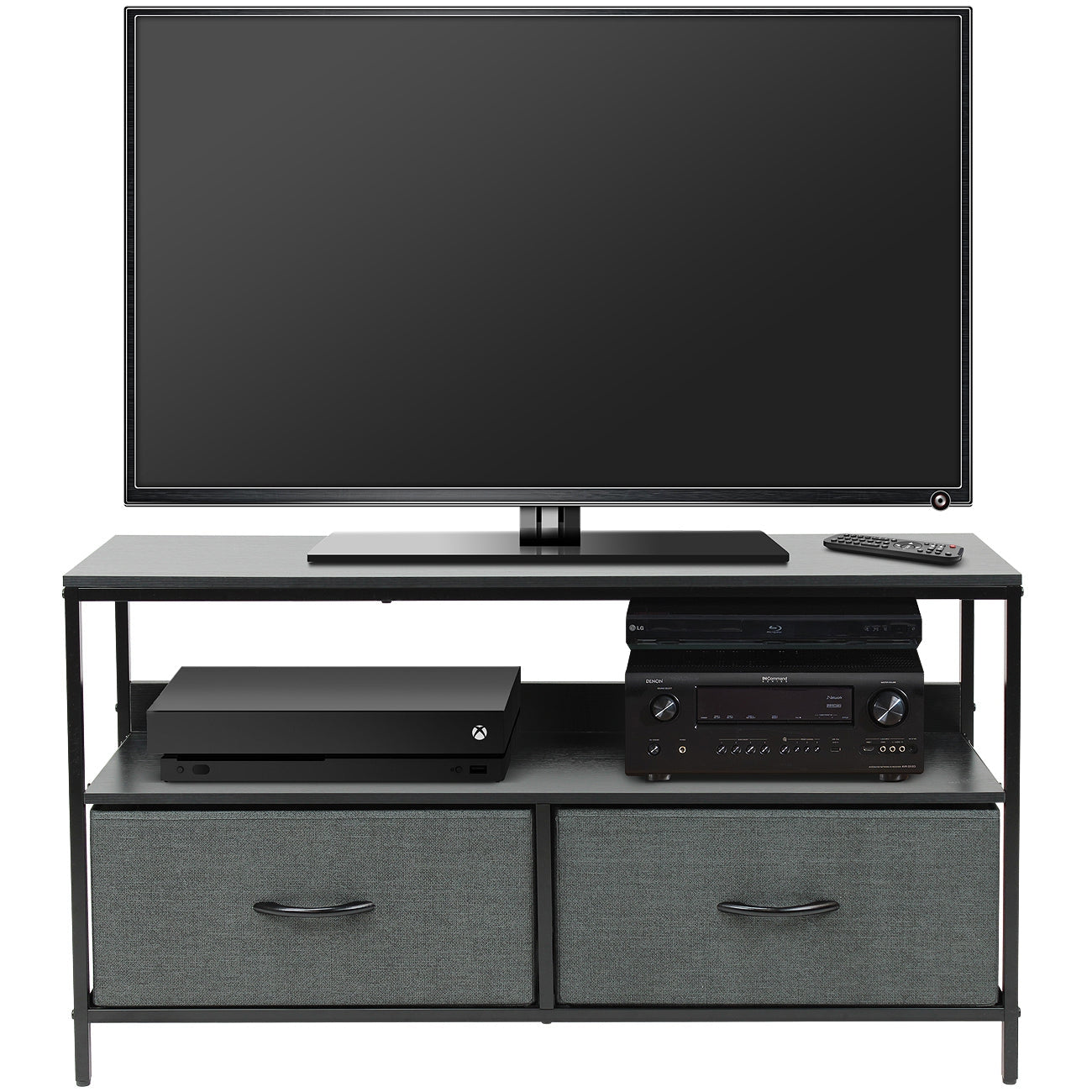 Organize and entertain with our TV Dresser Stand! Sleek and minimal, it features a faux wood top surface and strong steel frame. Two drawers pull out to reveal all your gadgets or everyday household items. Place anywhere from your living room, bedroom, or college dorm to get organized in style. The lightweight frame makes this unit easy to transport and when not in use, simply fold the fabric drawers flat for storage. Use alone or pair with similar styles from the Sorbus Furniture Collection.